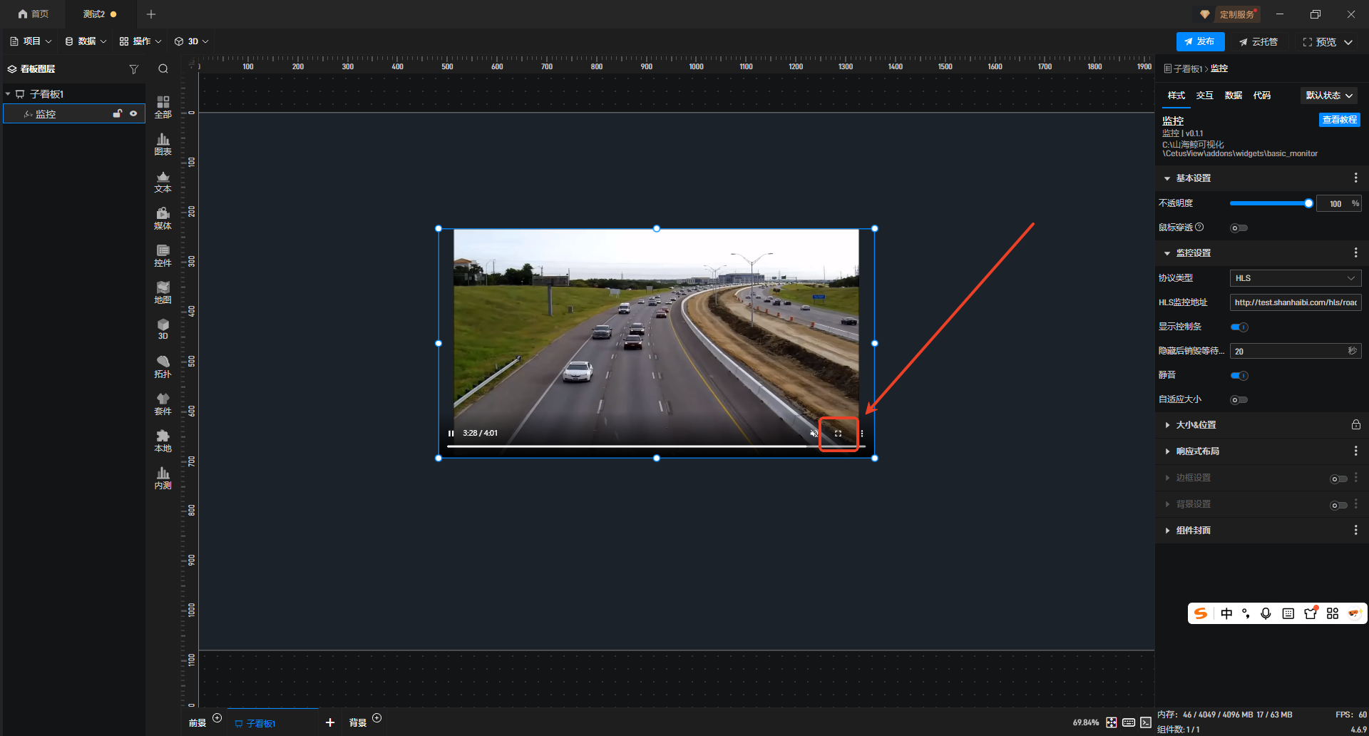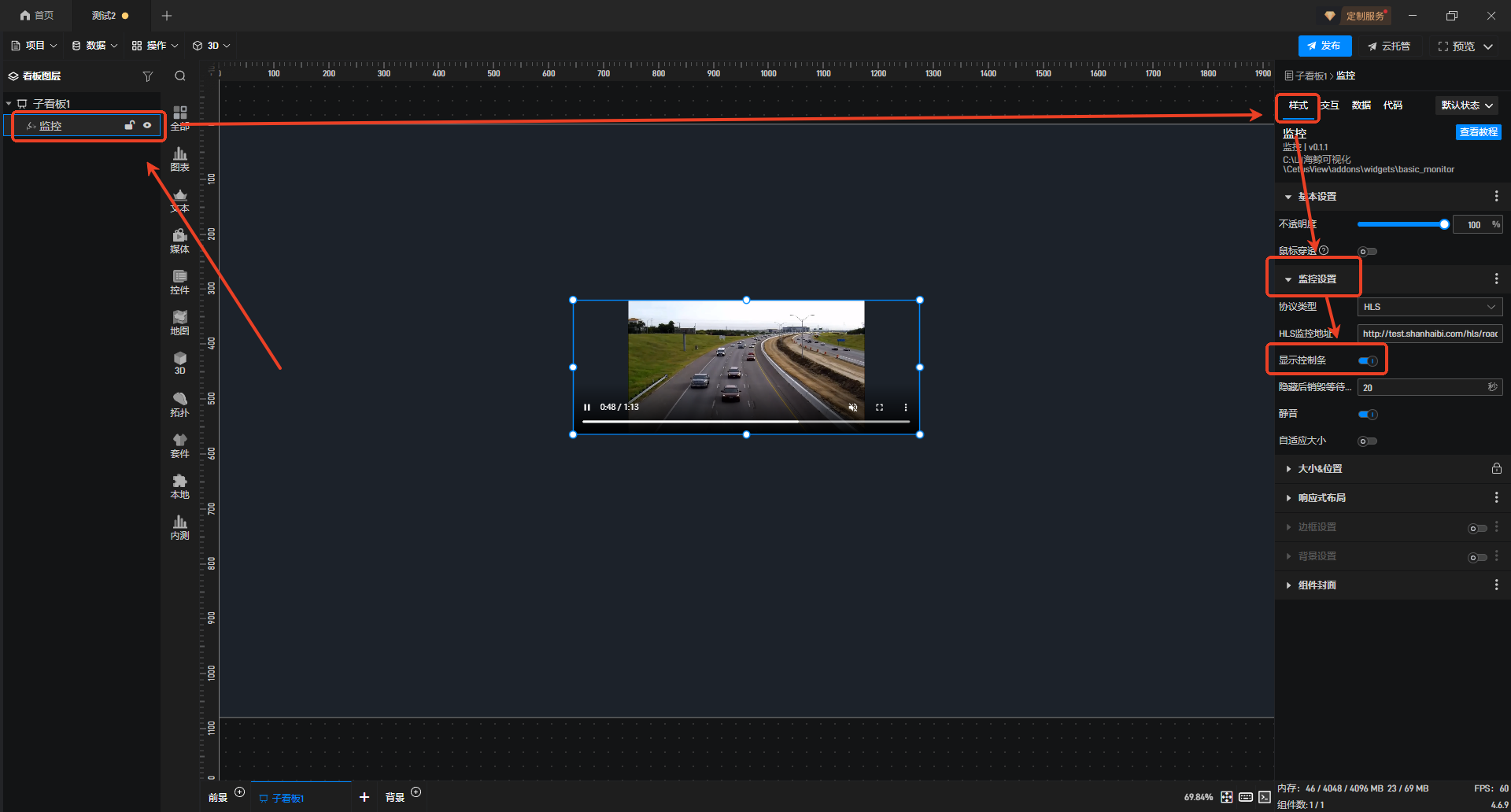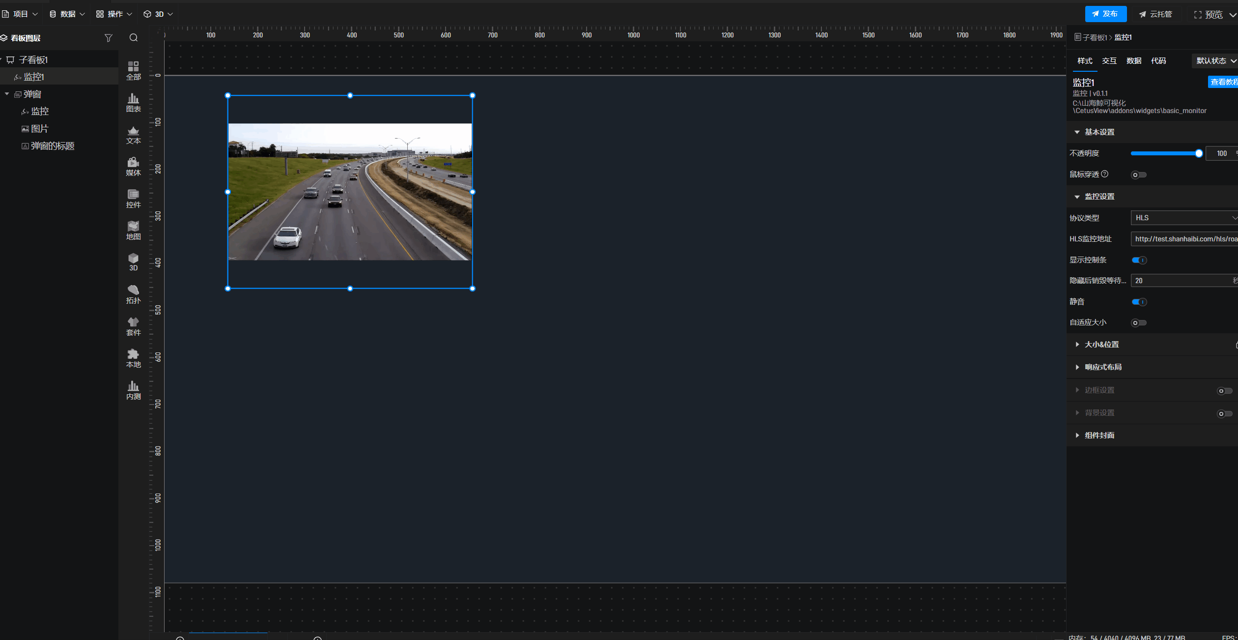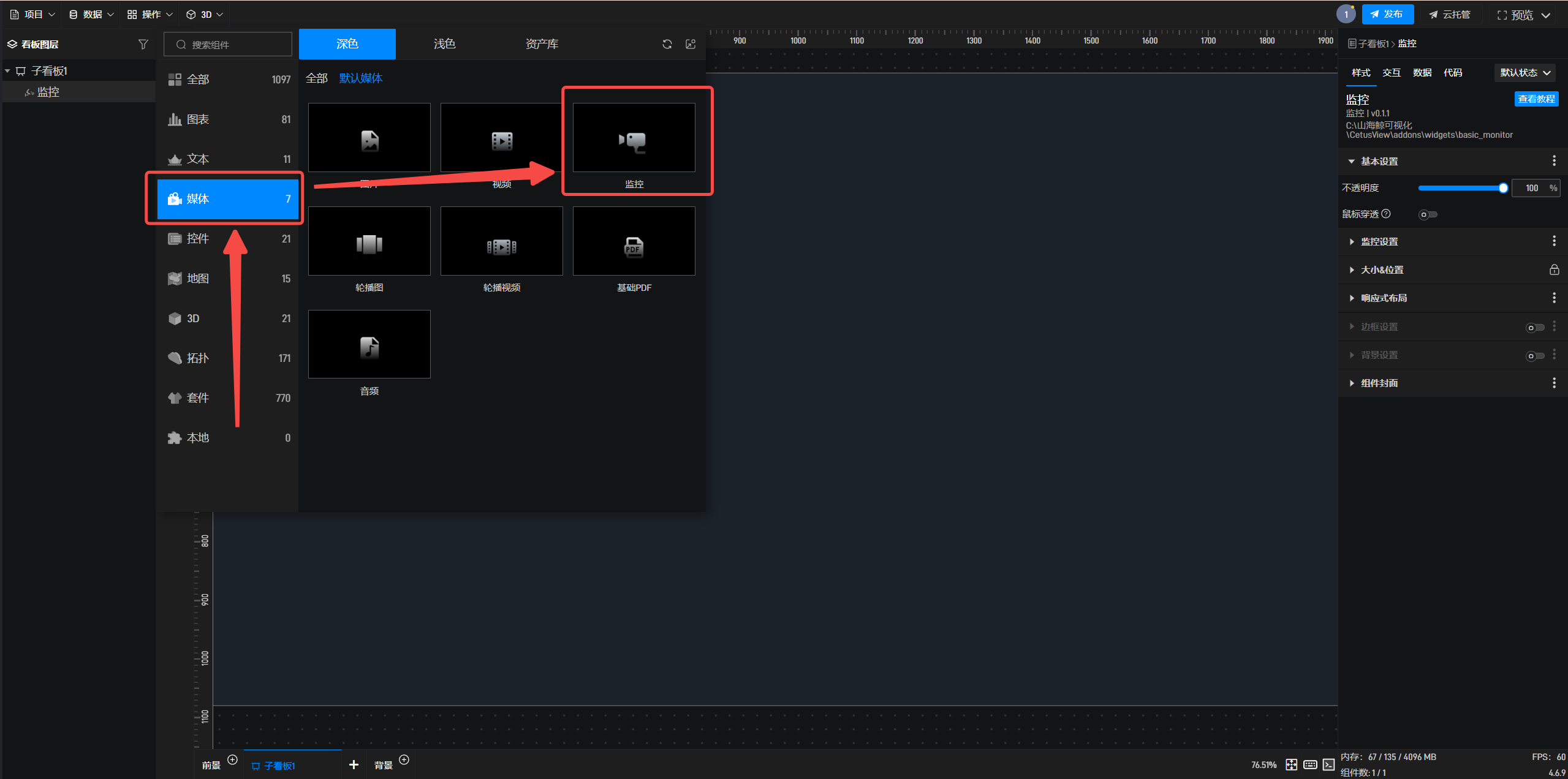 1.在左侧组件库中添加“监控”组件至项目中。