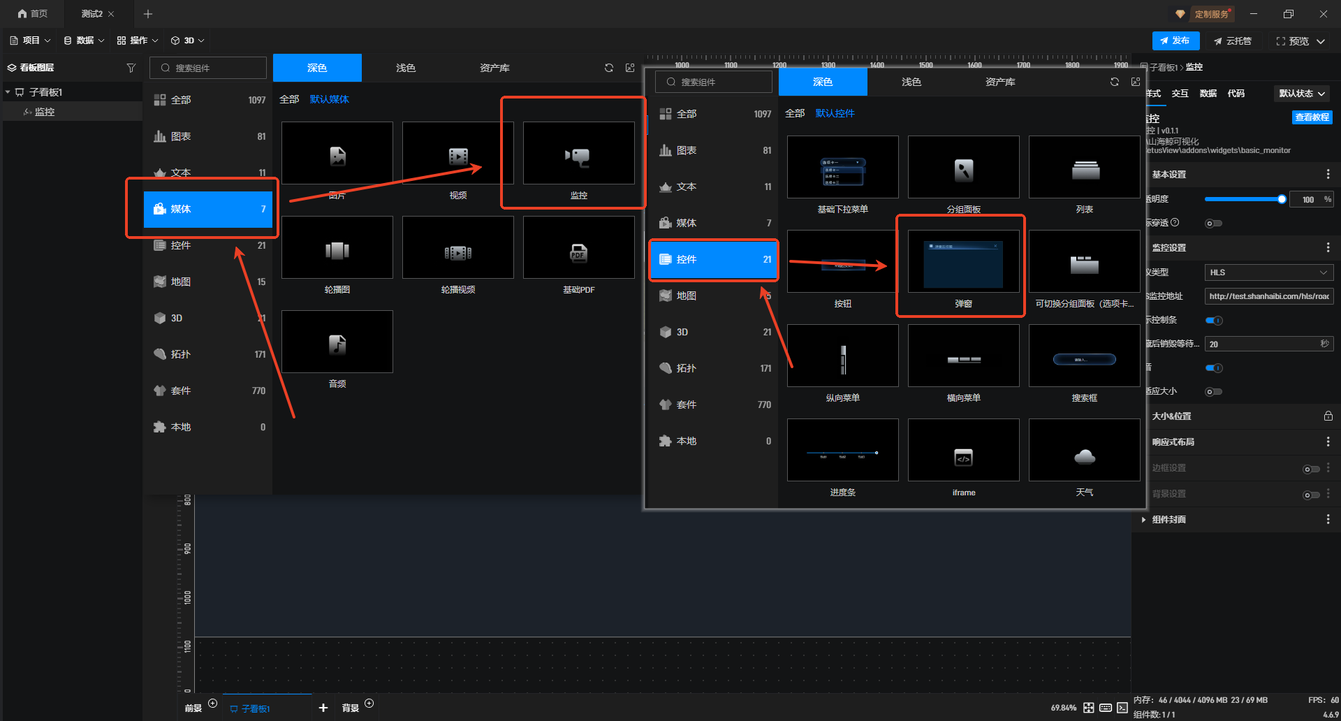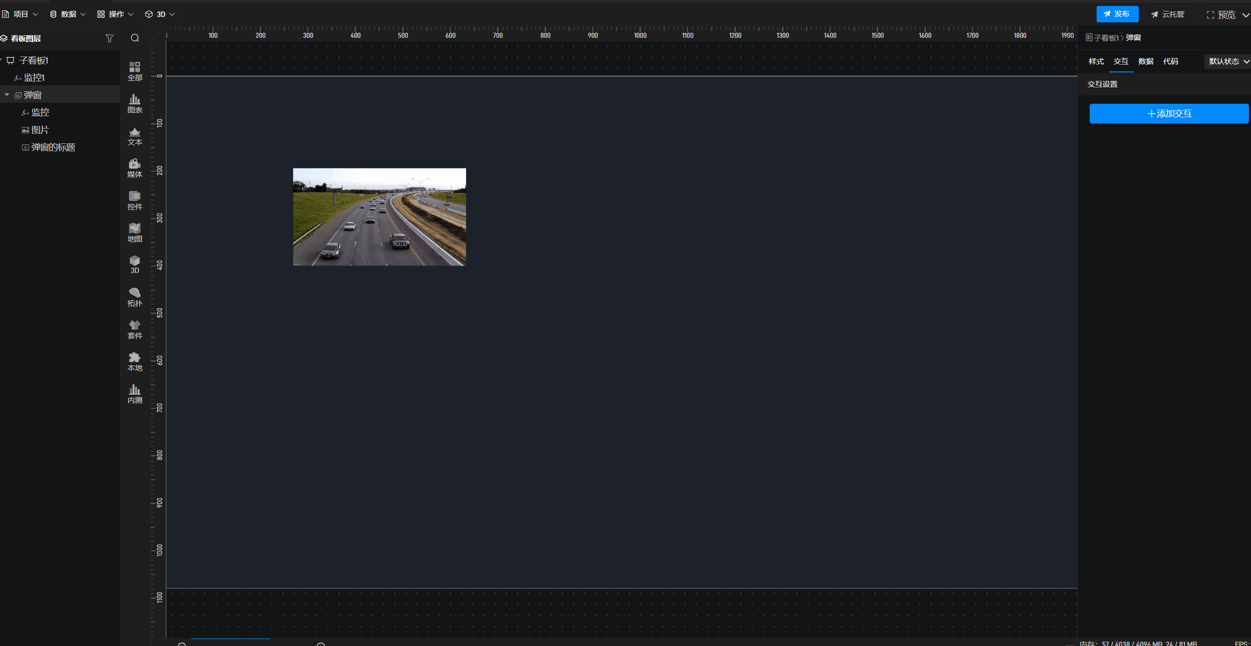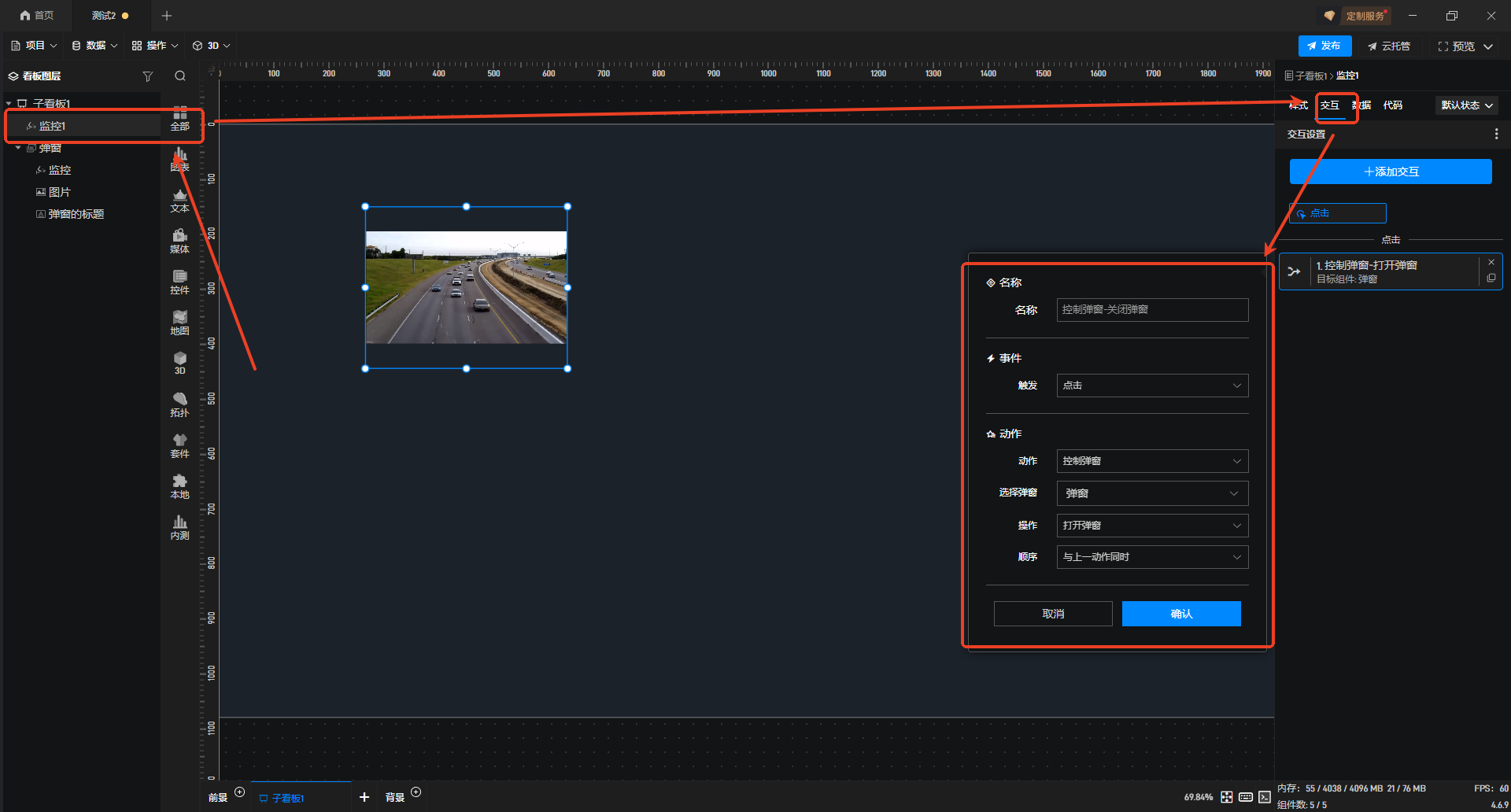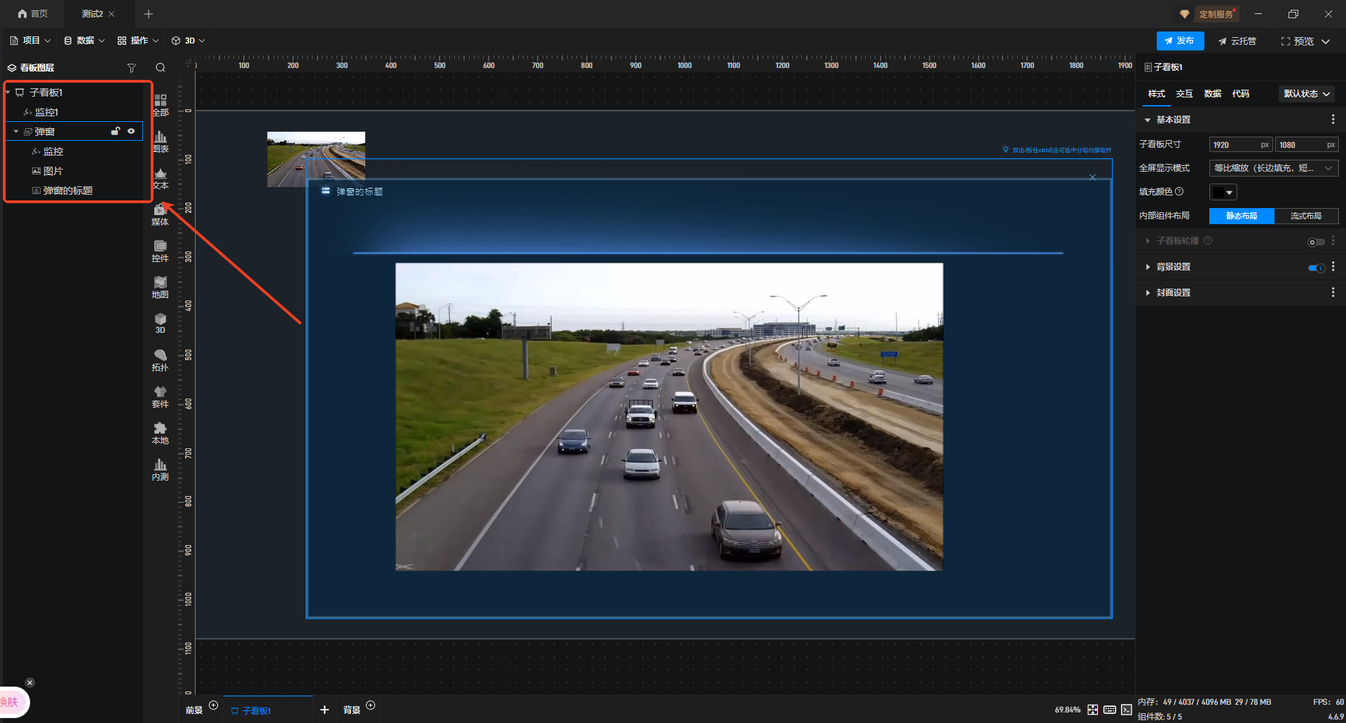 接着将“监控”添加至“弹窗”组件内,可按需调整弹窗尺寸;同时选中“子看板”,新增一个“弹窗”组件并完成重命名。