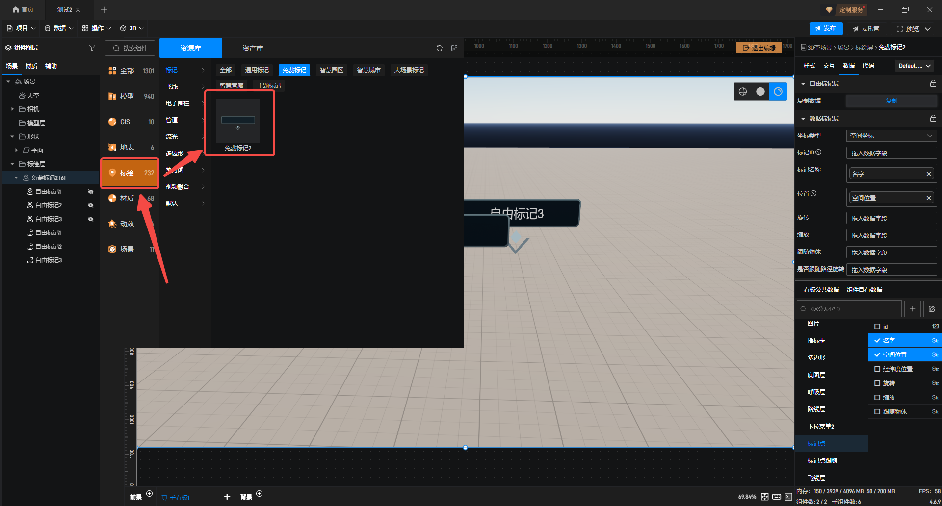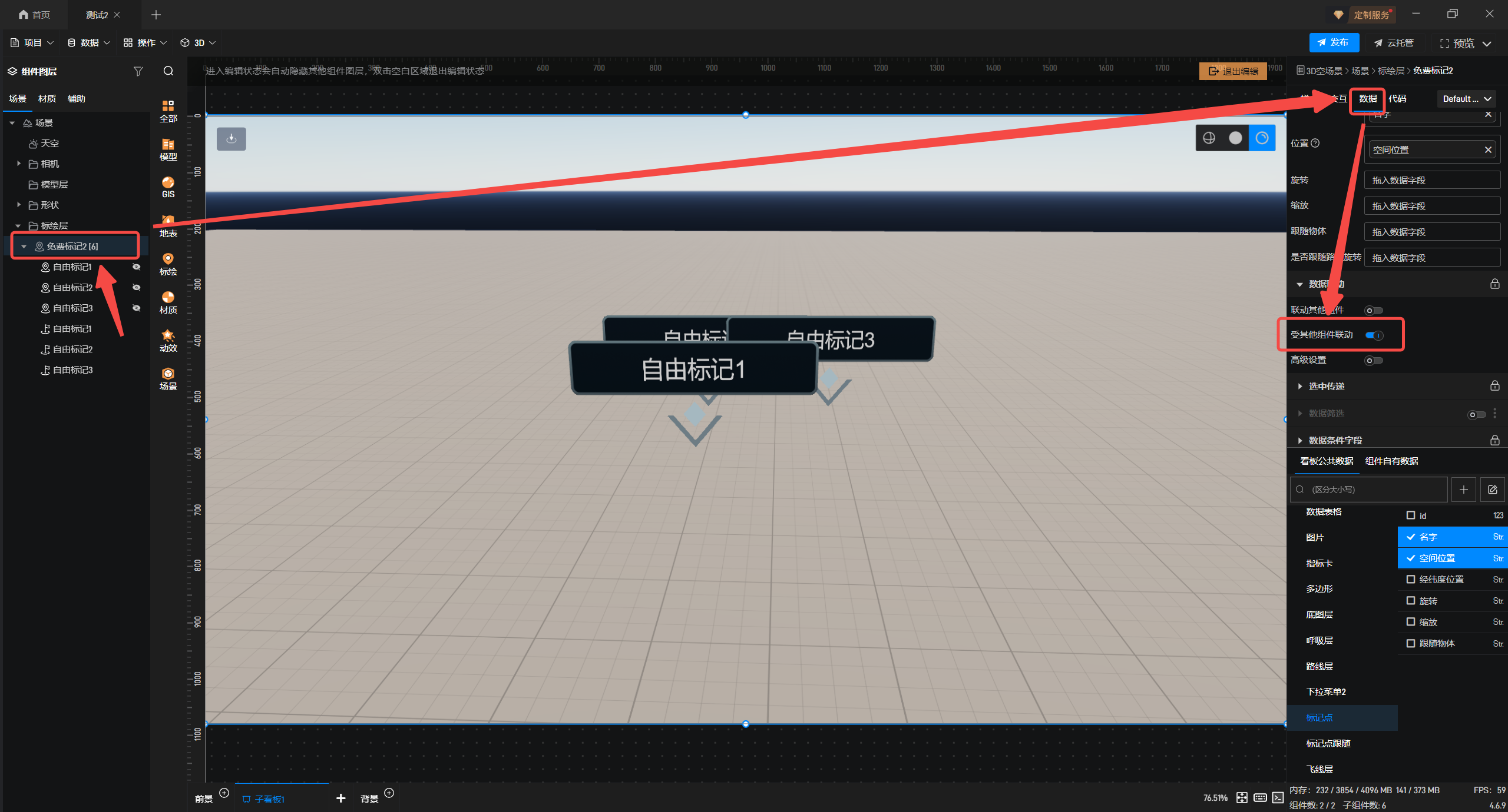 接着选择“免费标记2”,右击“复制数据”粘贴至Excel中,再将对应数据勾选添加到当前标记点中,并将手动添加的标记点隐藏,详情可参考此教程:标记点概述 - 项目制作 - 数字孪生开发教程-可视化大屏制作教程 - 山海鲸可视化
