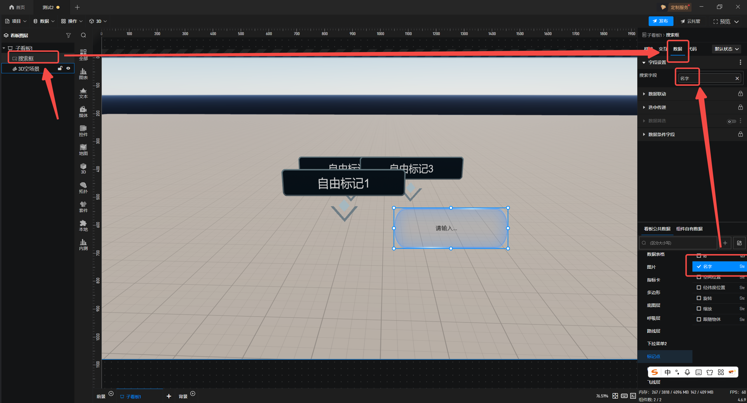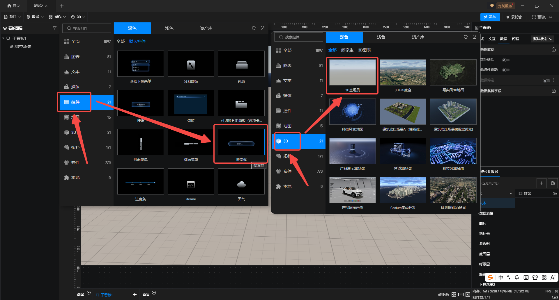 1.在左侧组件库添加“3D空场景”和“搜索框”组件至项目中。