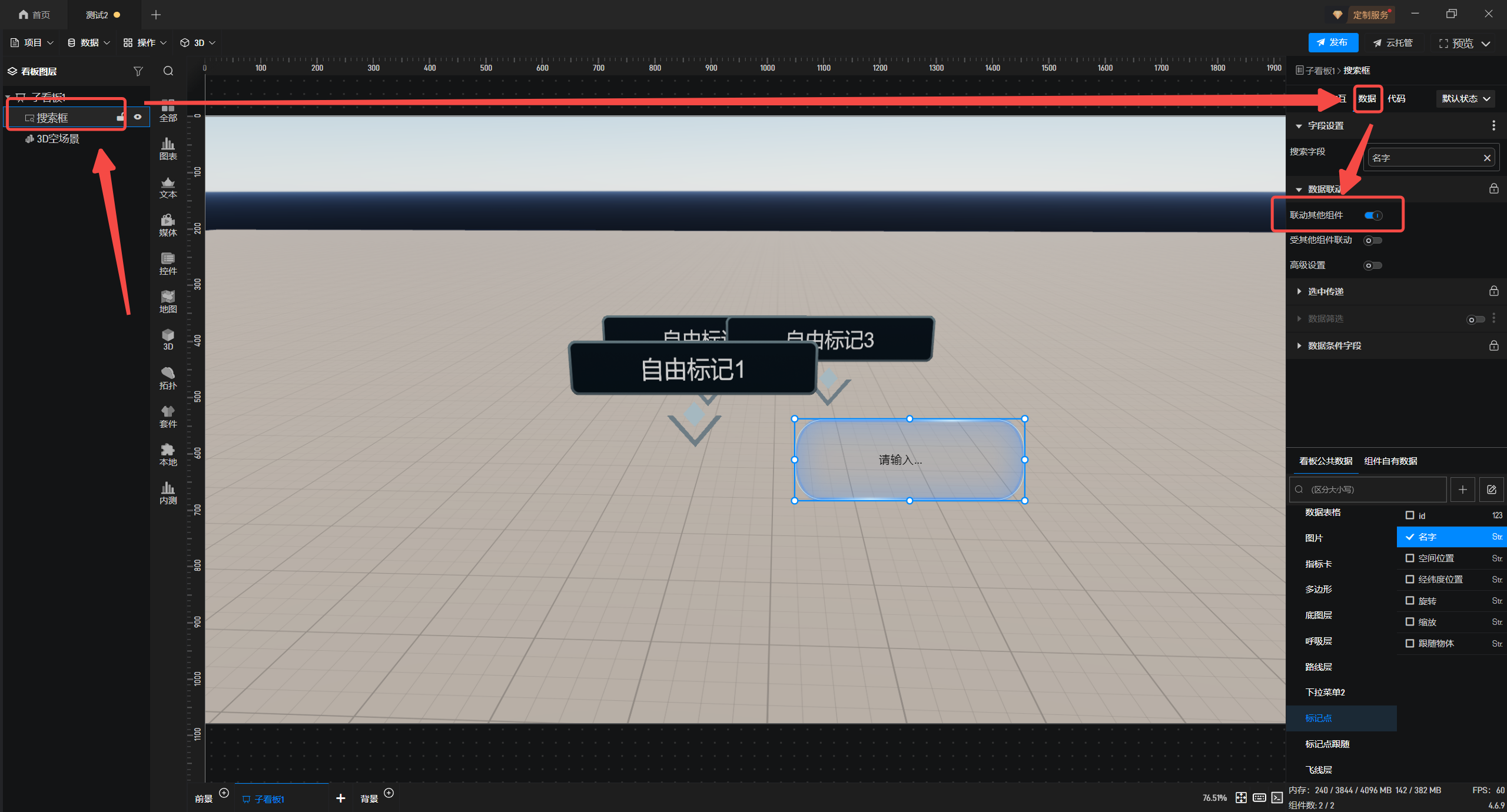 4.退出编辑模式,选择搜索框,勾选需要搜索标记点名称的字段。