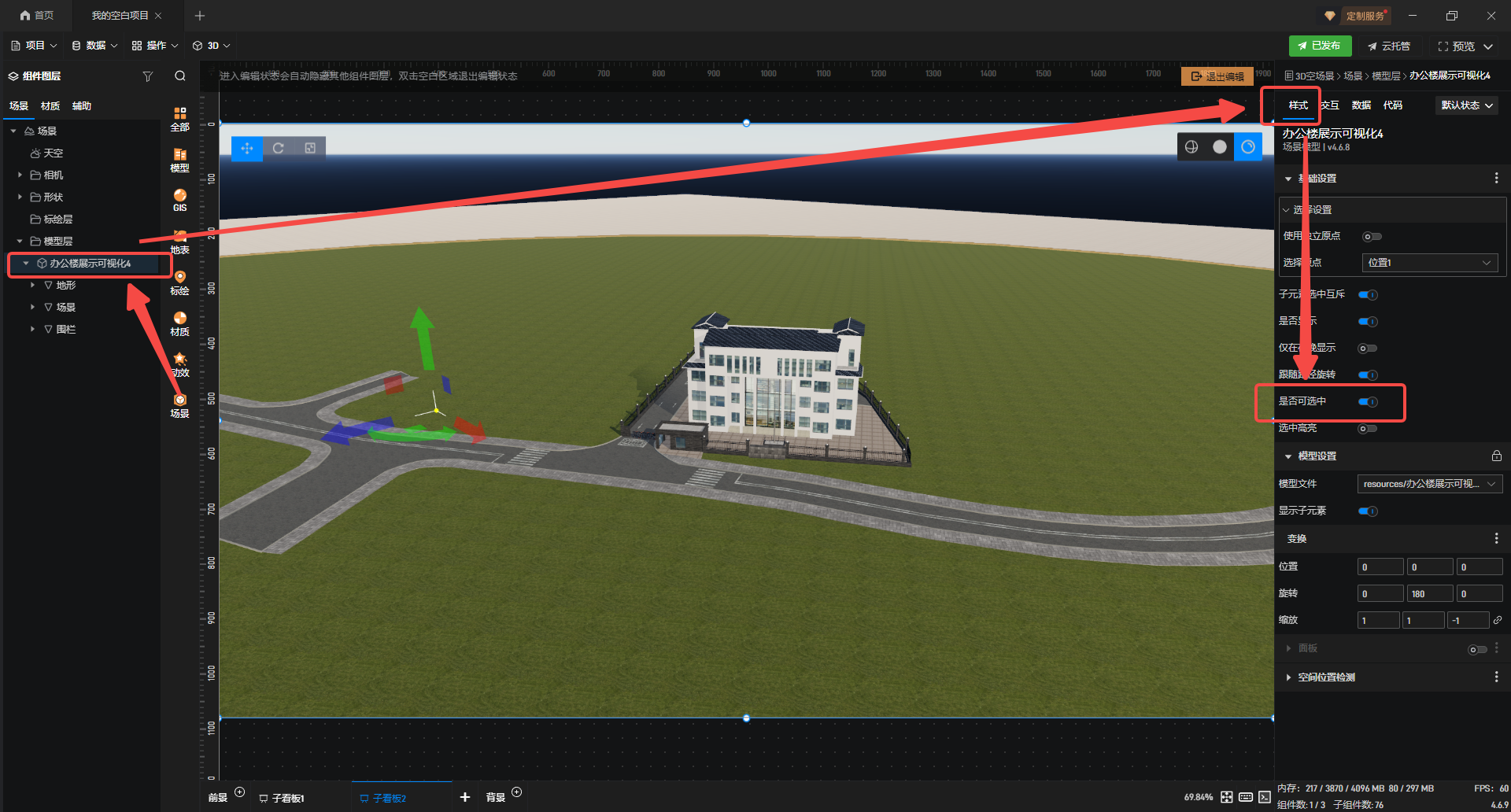 2.选中模型,在右侧配置栏,选择“样式”,开启“是否可选中”选项。