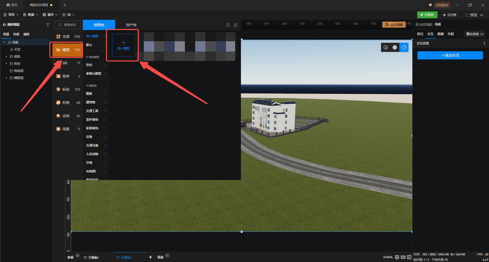 接着双击进入编辑界面,导入相关模型。