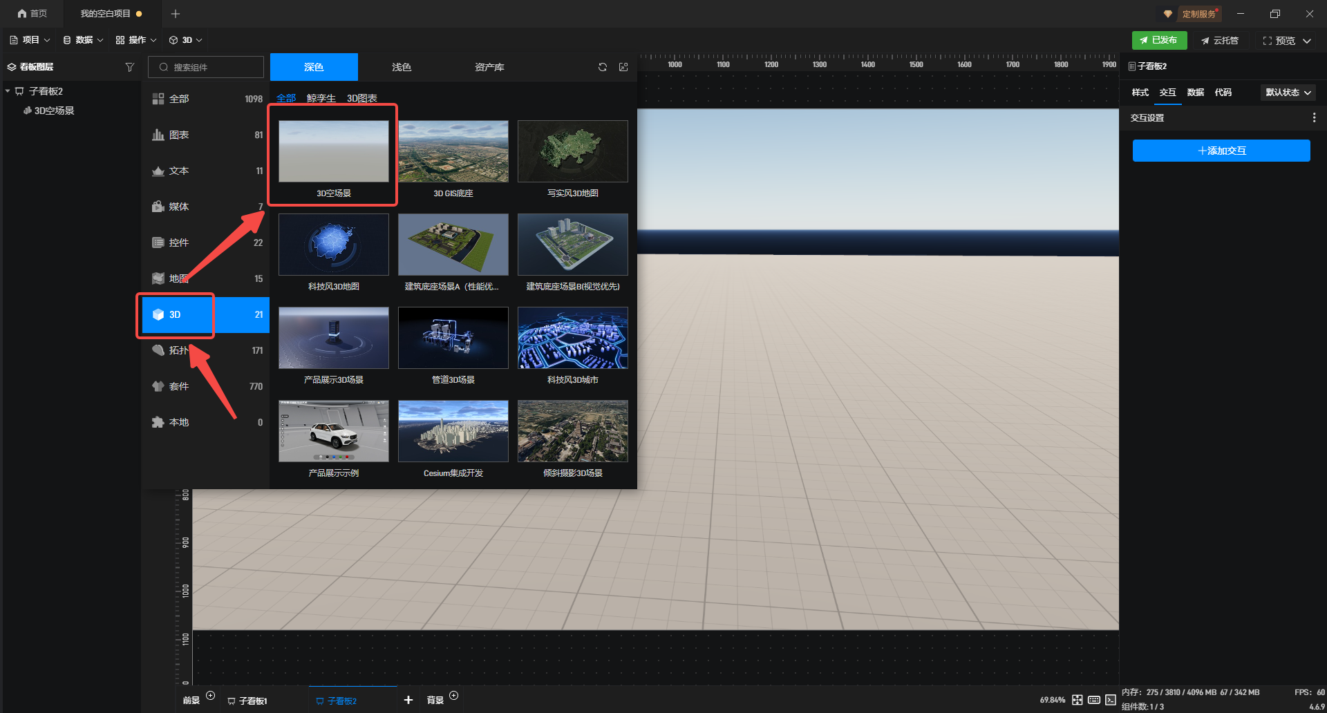 1.在左侧添加“3D空场景”至项目中。
