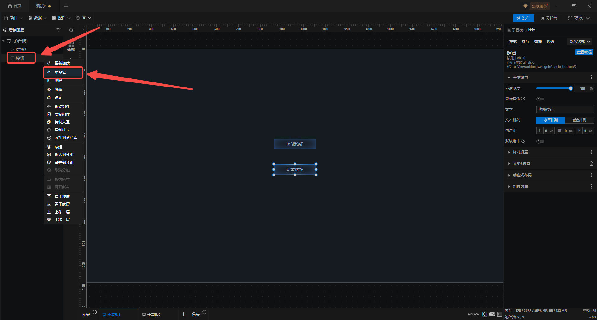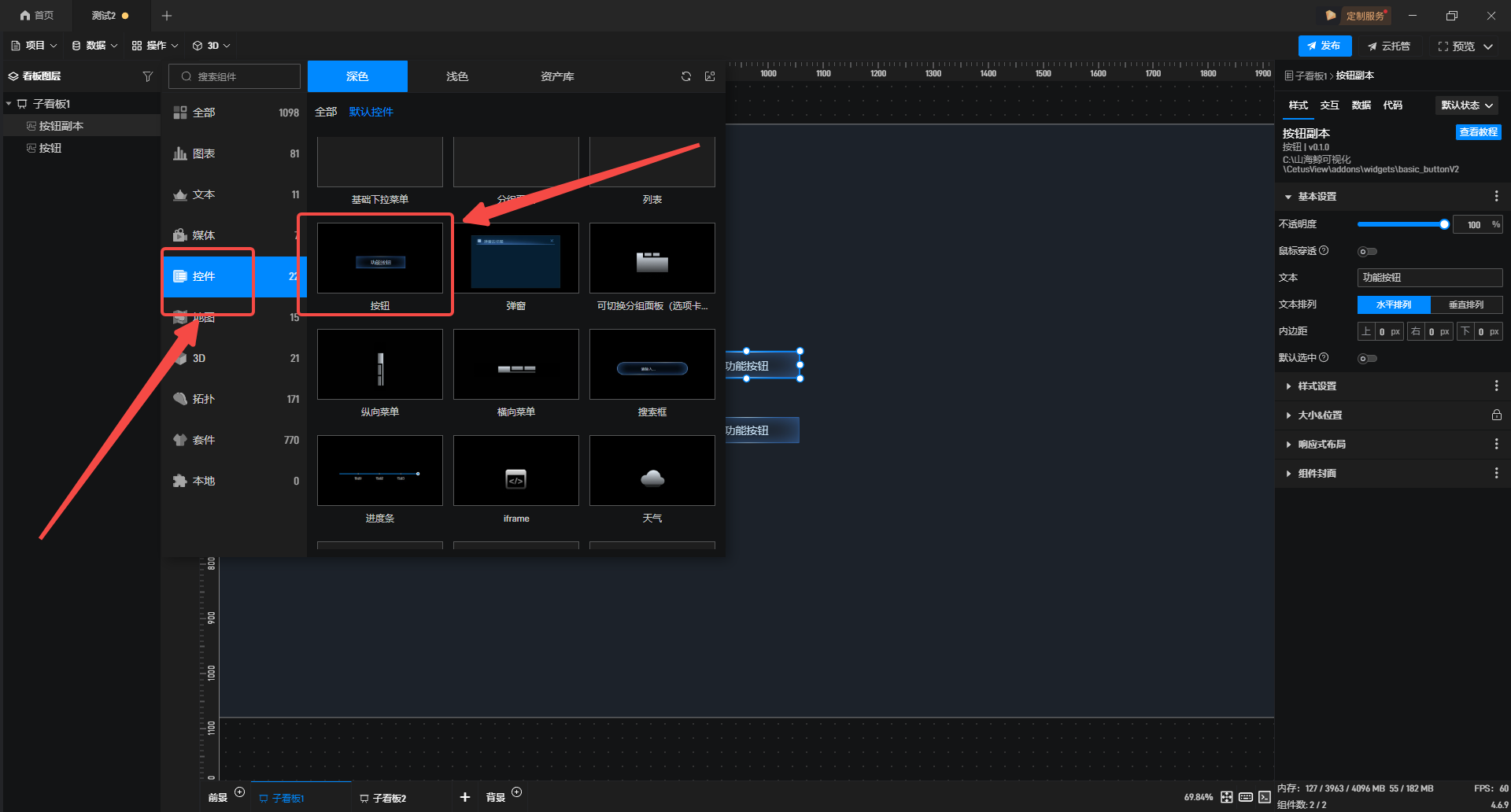 1.在左侧组件库添加两个“按钮”组件至项目中