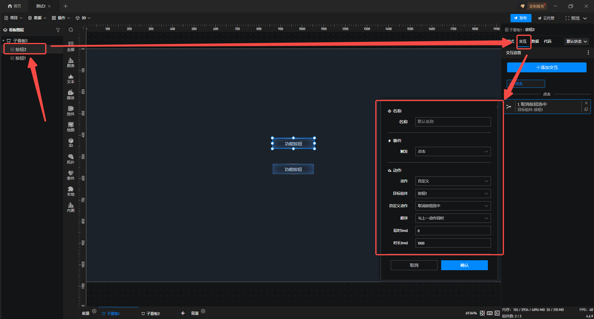 3.选中按钮 2,在右侧配置栏选择“交互”设置,触发“点击”事件并执行“自定义”动作;将目标组件设为 “按钮 1”,自定义动作选择 “取消按钮选中” 即可。