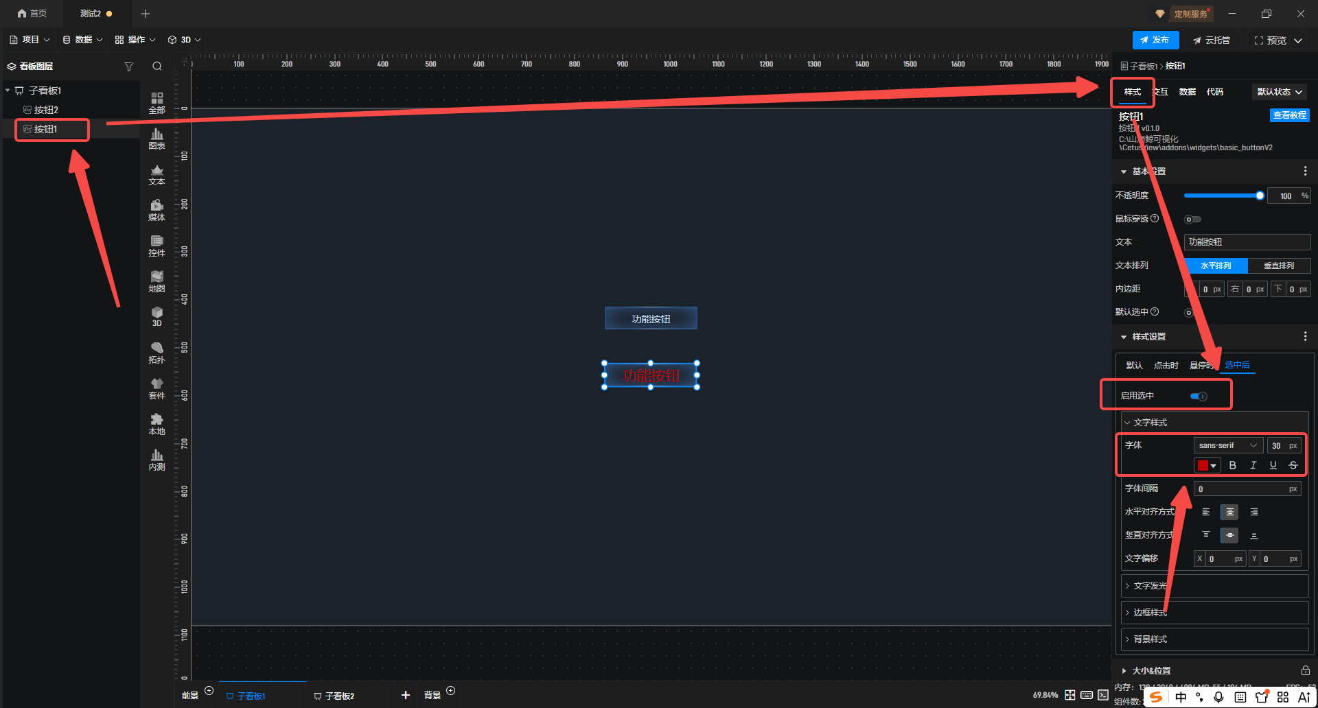2.选中按钮 1,在右侧“样式”面板中进入“样式设置”,在“选中后”选项下开启“启用选中”;并在“文字样式”中调整“字体”大小与颜色,以便清晰区分状态。