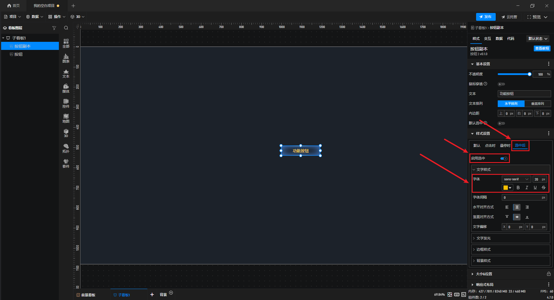 2. 选中该组件,同时在右侧“样式”设置中修改选中后的样式,例如这里我将选中后的文字色修改为了橙色。
