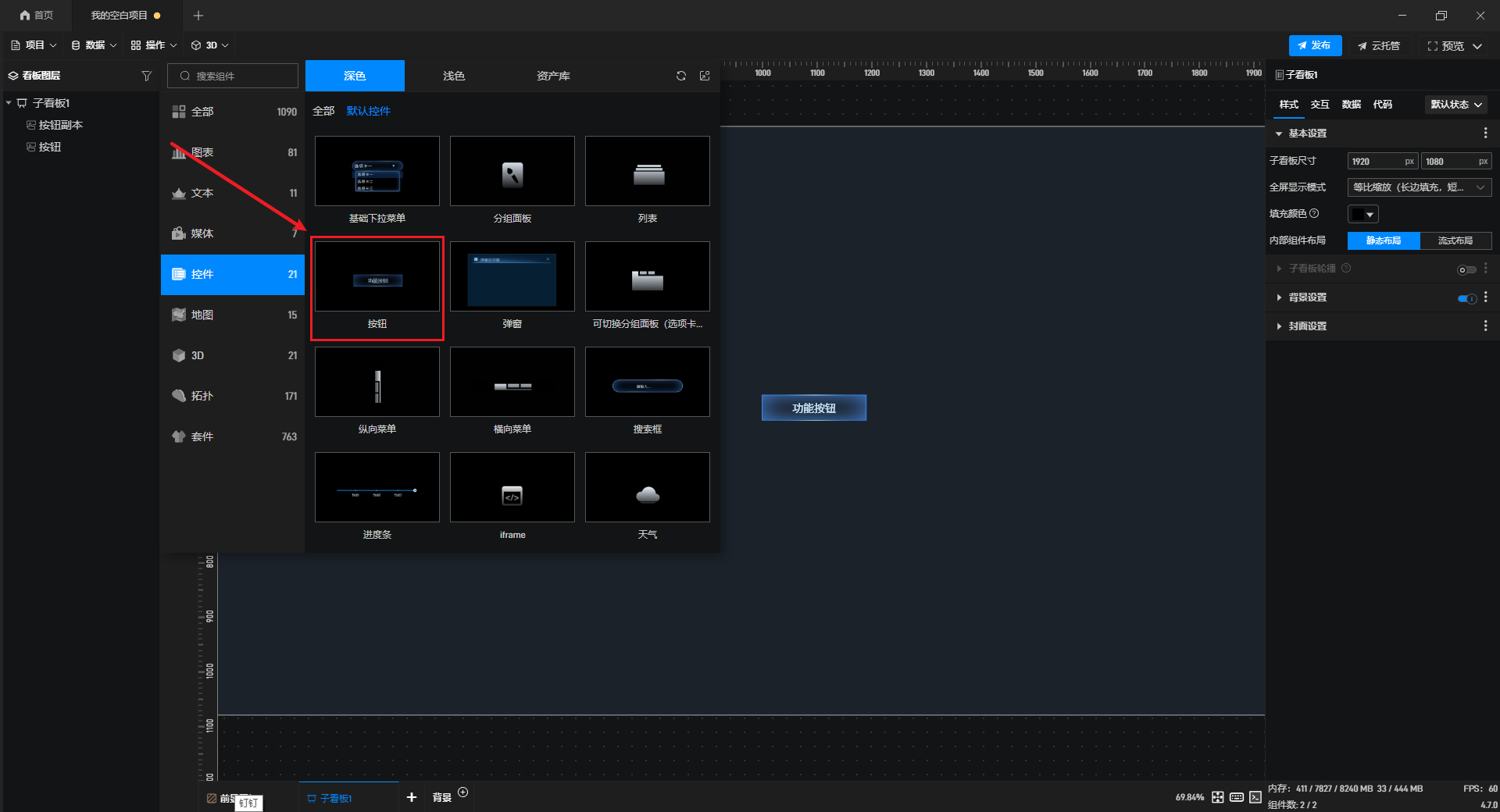 1. 首先,在左侧组件库中选择一个“按钮”组件添加。