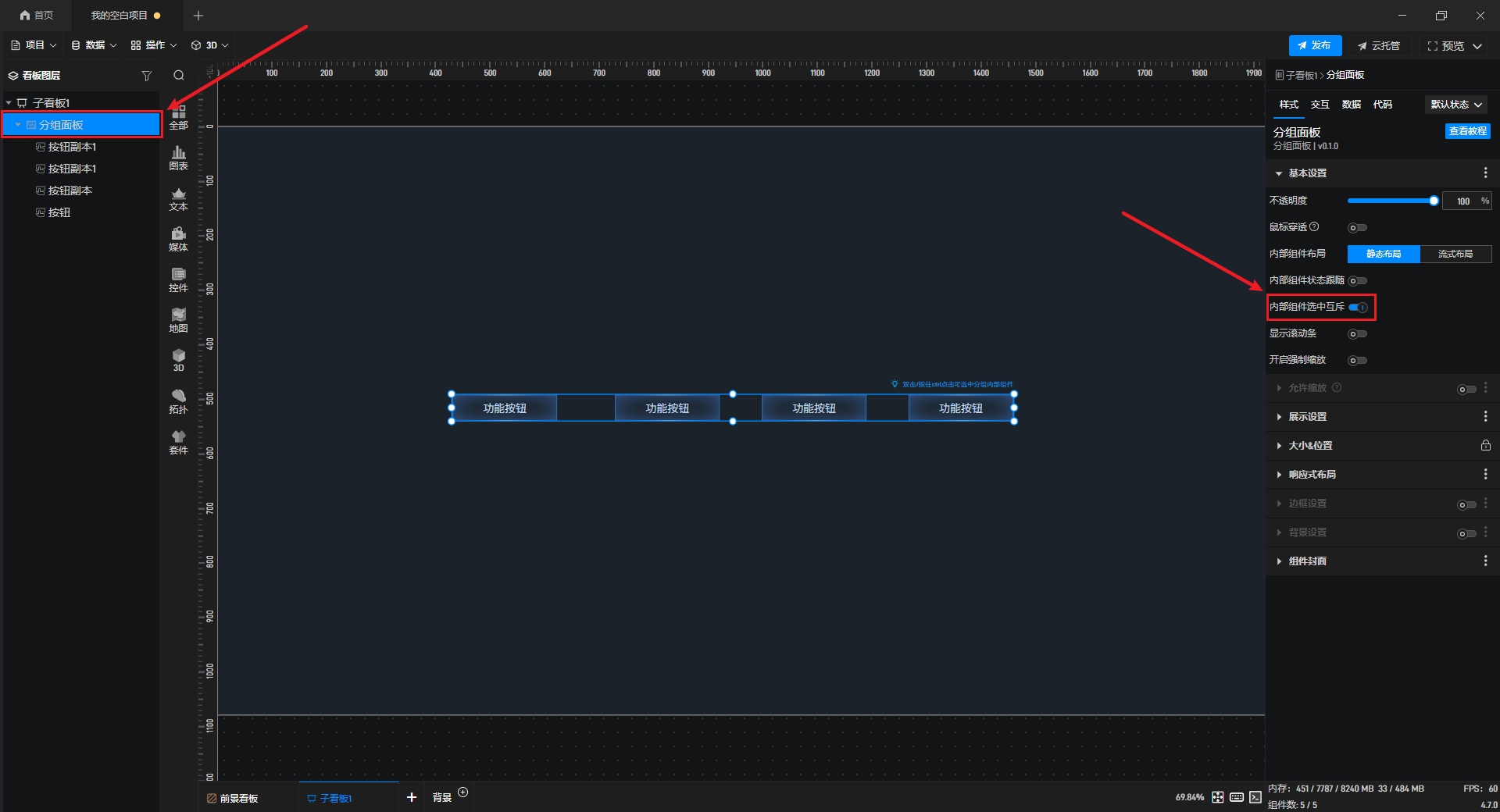 4. 选中该分组后,在右侧“样式”设置中开启“内部组件选中互斥”。