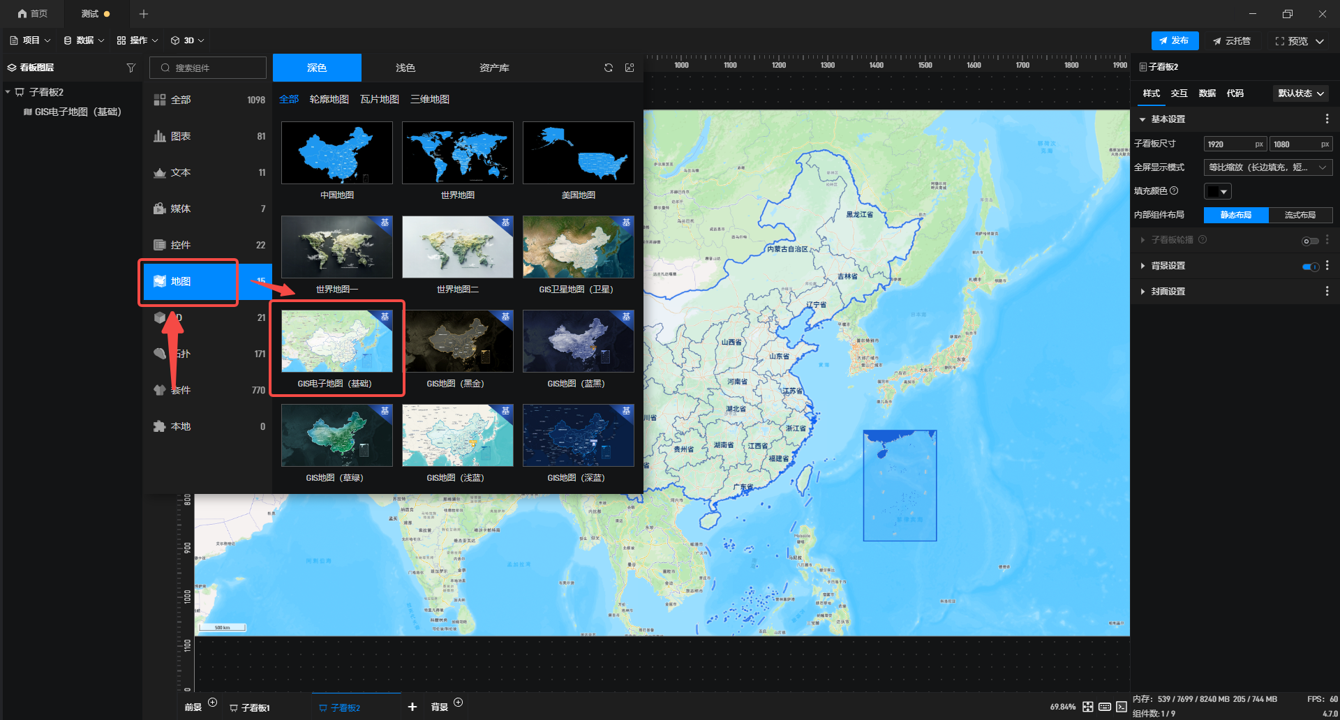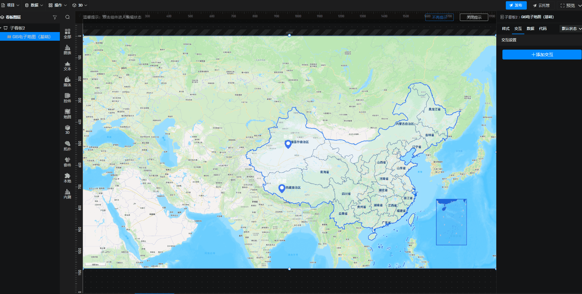 1.在左侧组件库添加“GIS电子地图(基础)”至项目中。