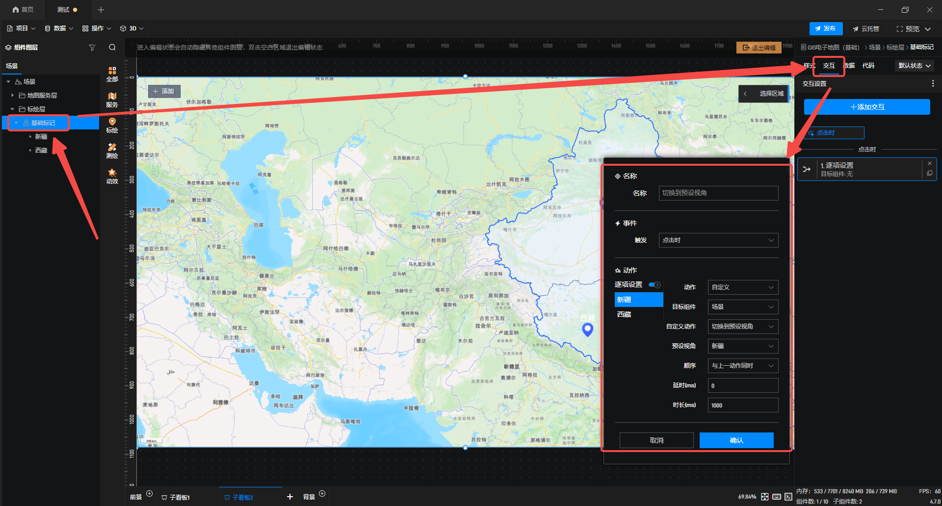3.选择基础标记组,在右侧添加“交互”,触发“点击”操作并开启“逐项设置”,“自定义动作”设为“切换到预设视角”,“目标组件”为“场景”,并匹配对应的“预设视角”即可完成配置。
