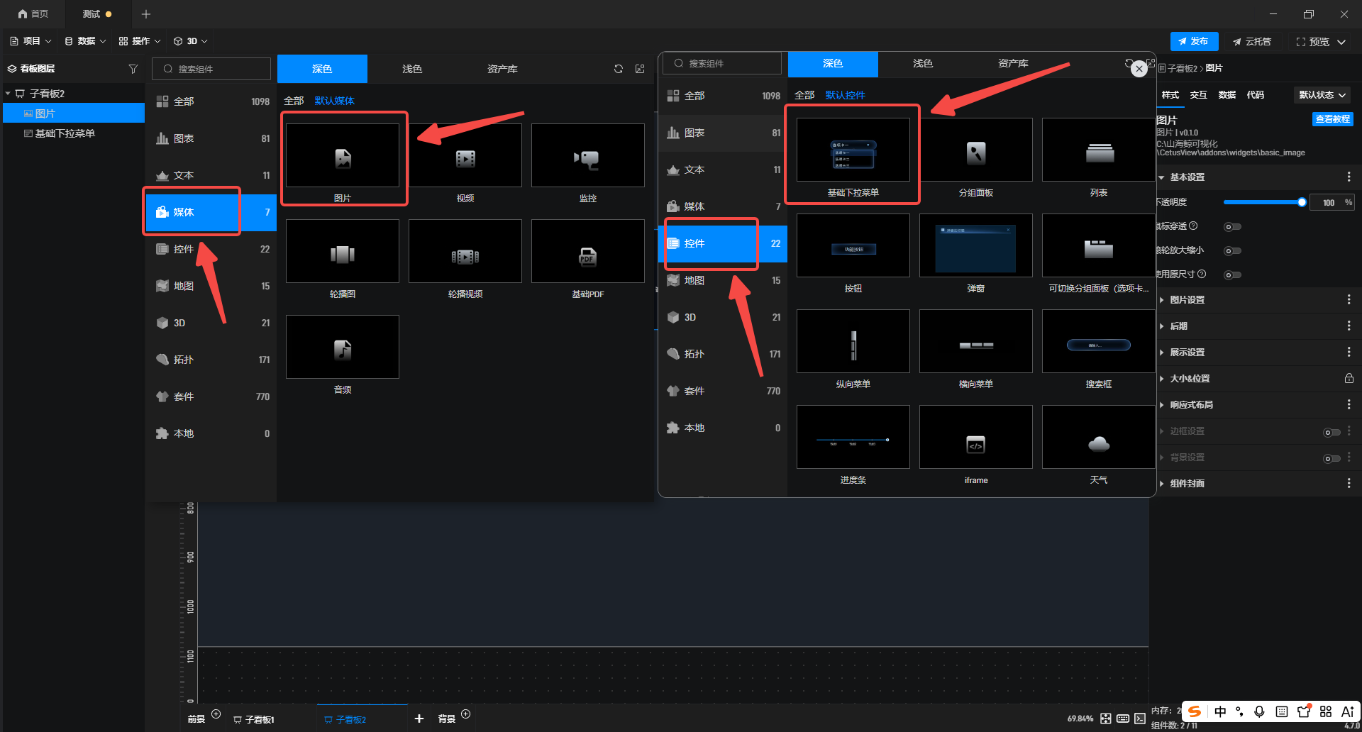 1.在左侧组件库内添加“基础下拉菜单”和“图片”组件至项目中, 实际场景中也可替换为 “监控”或者“视频”组件,下文以图片组件为例进行讲解。