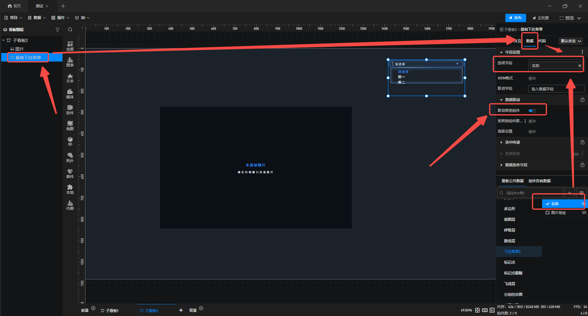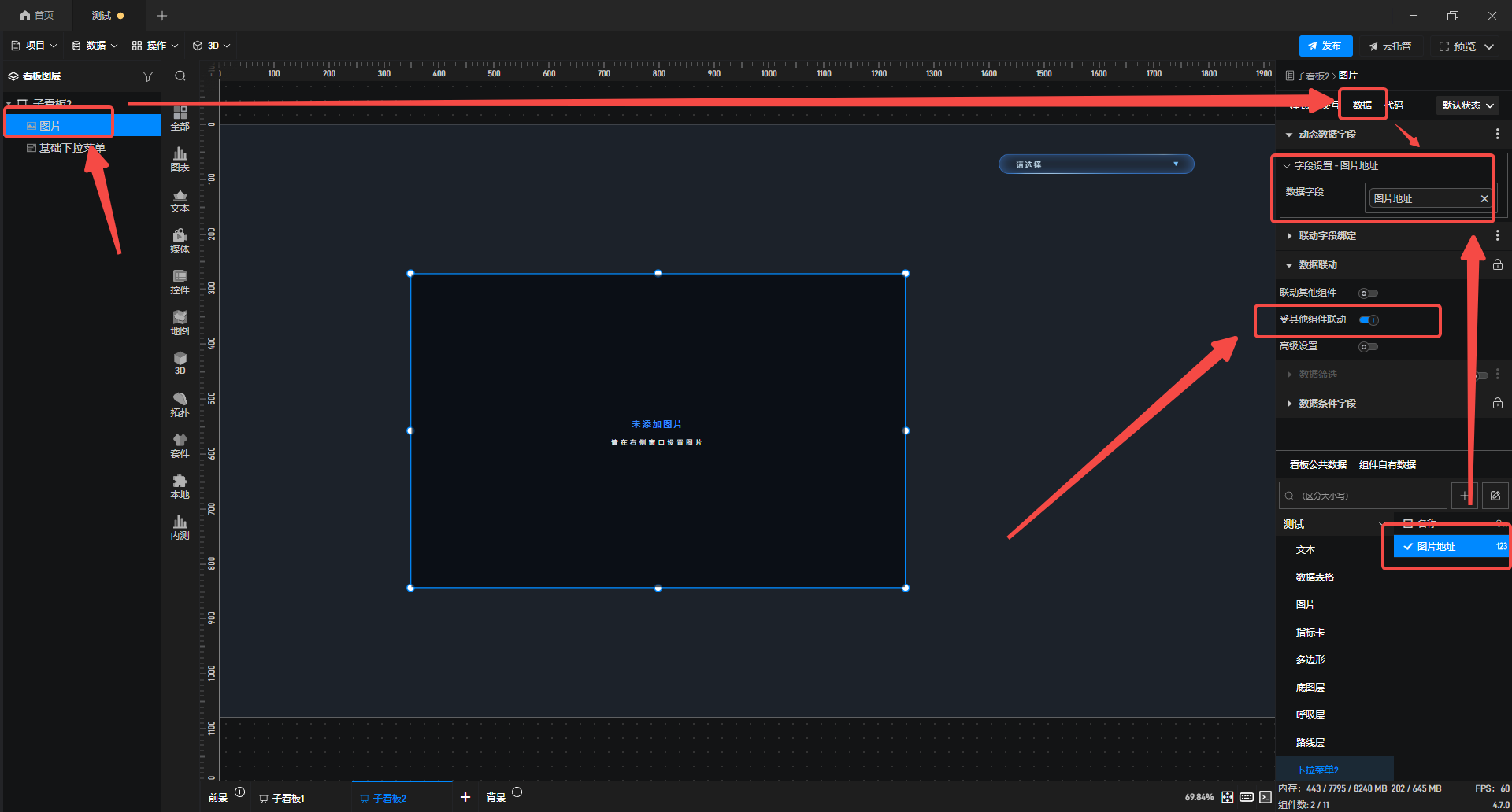接着选中图片,在“数据”配置栏勾选相应的数据,同时开启“受其他组件联动”。