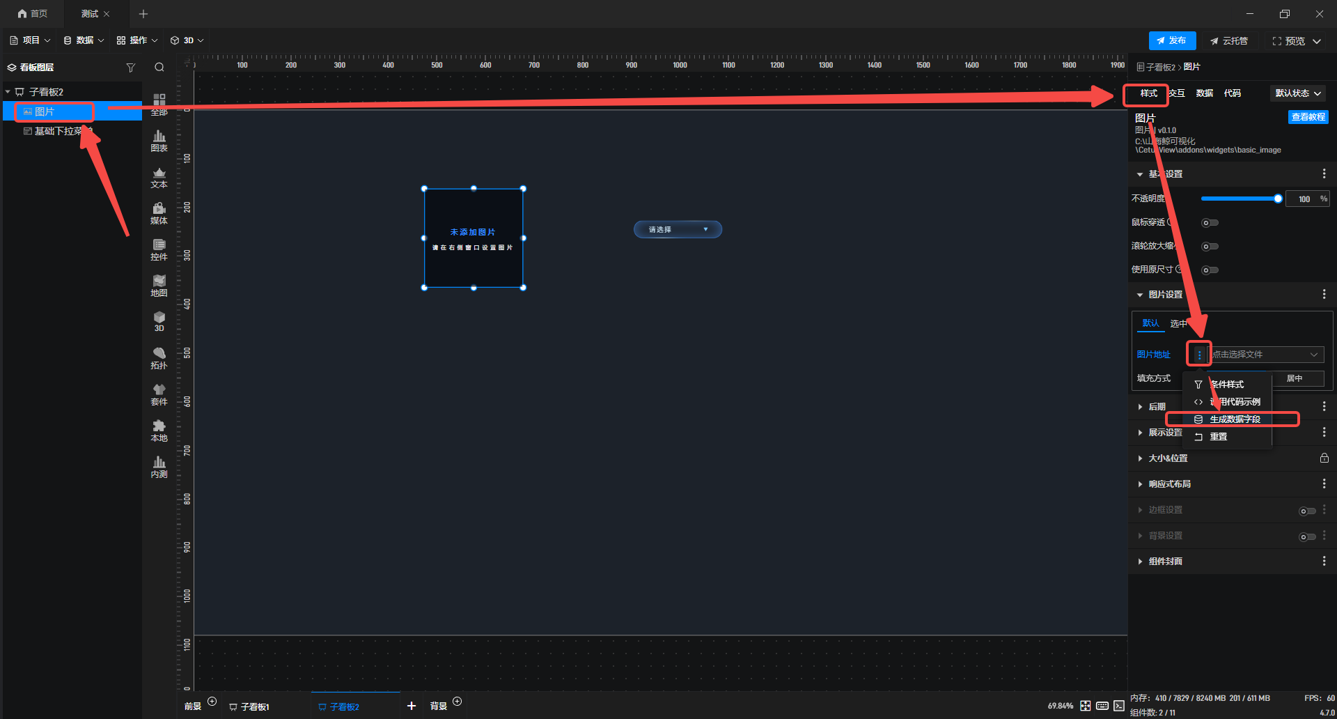 选中图片组件,在右侧“样式”配置栏中找到“图片地址”,点击其“扩展选项”并选择“生成数据字段”。
