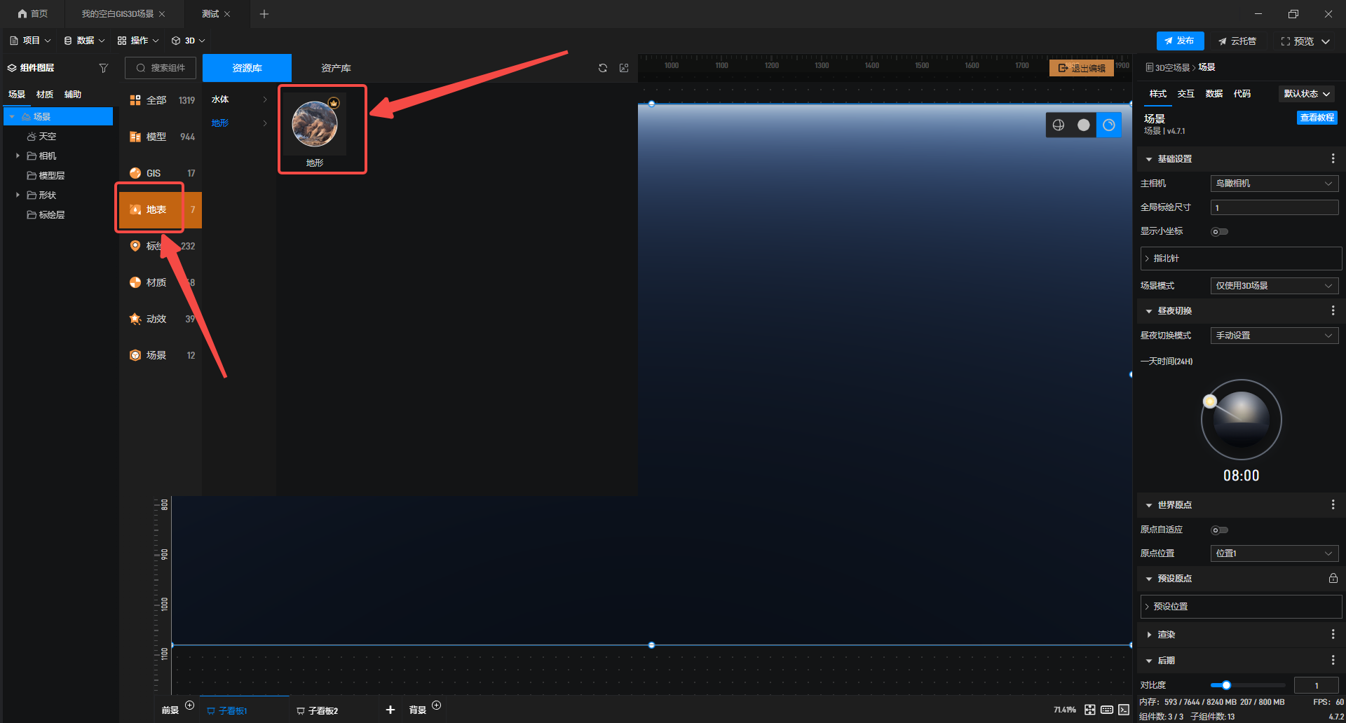 接着双击进入编辑界面,在左侧选择“地表”,添加“地形”。
