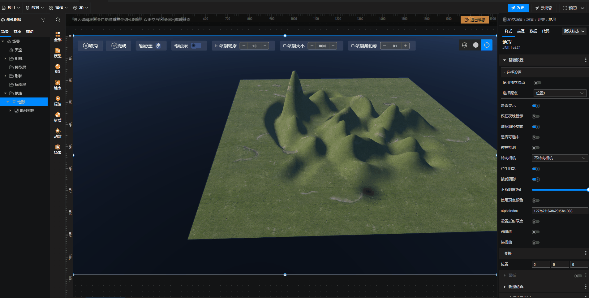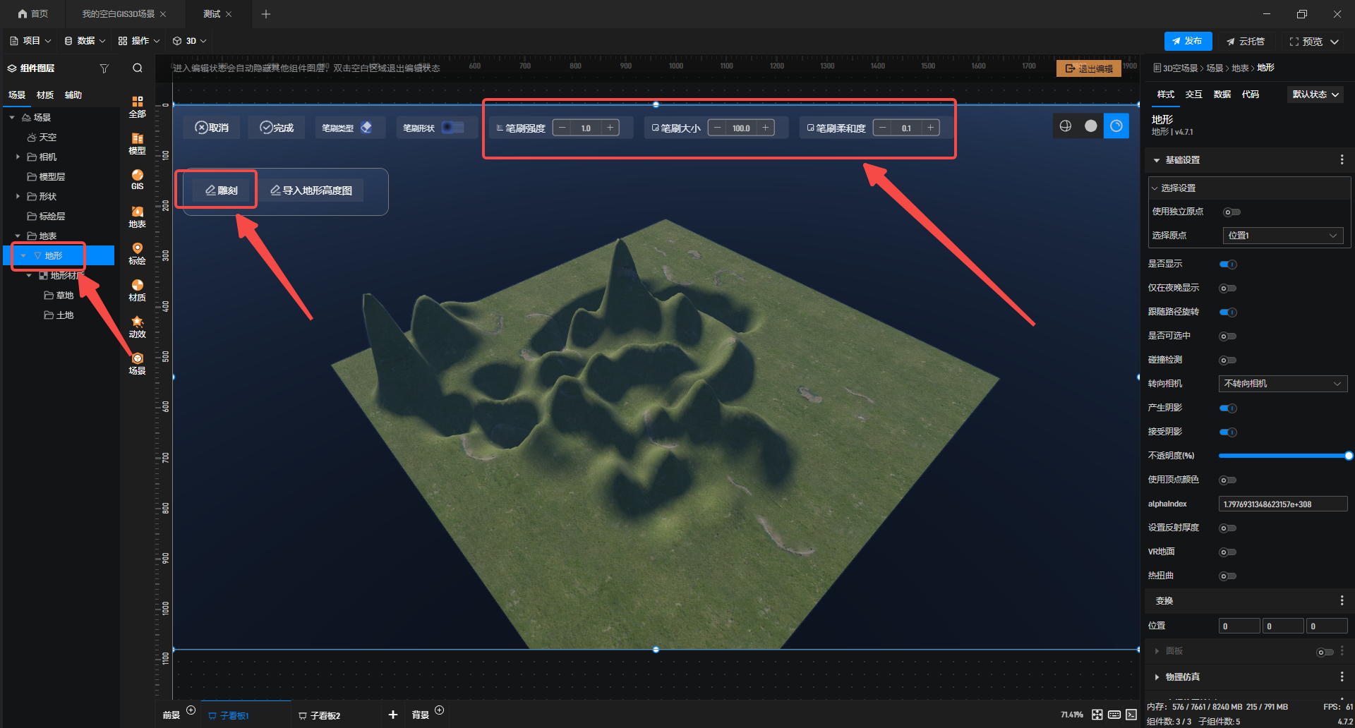 2.选中地形,选择“雕刻”,可以按需调整“笔刷大小”,“笔刷强度”和“笔刷柔和度”。