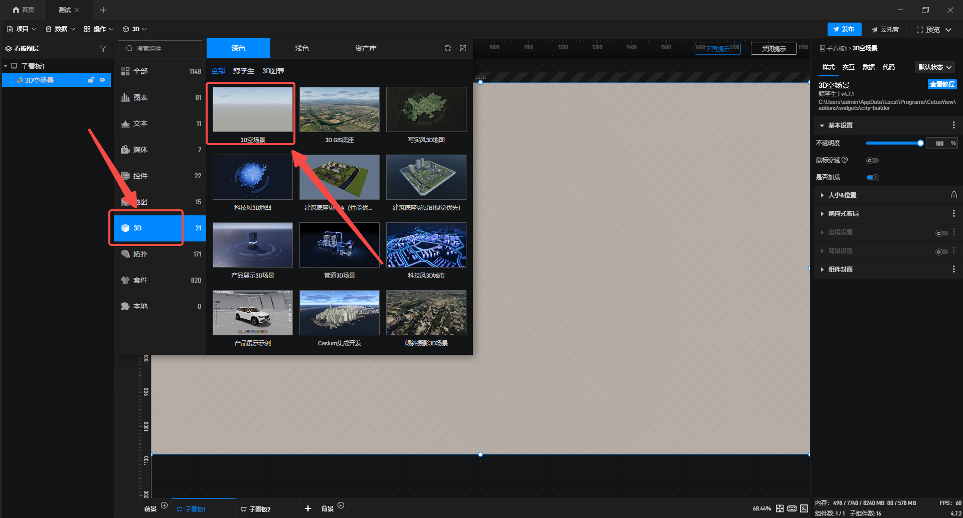 1.在左侧组件库中添加“3D空场景”至项目中。