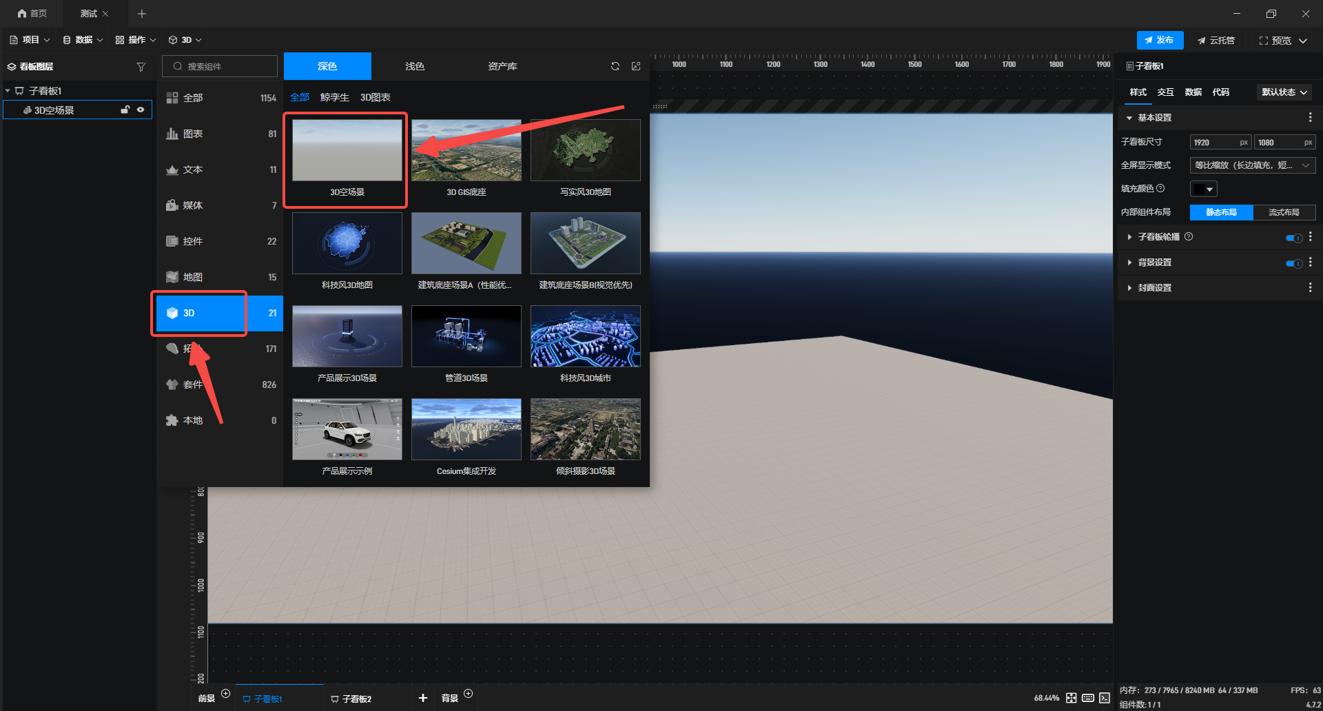 1.在左侧组件库中添加“3D空场景”至项目中。