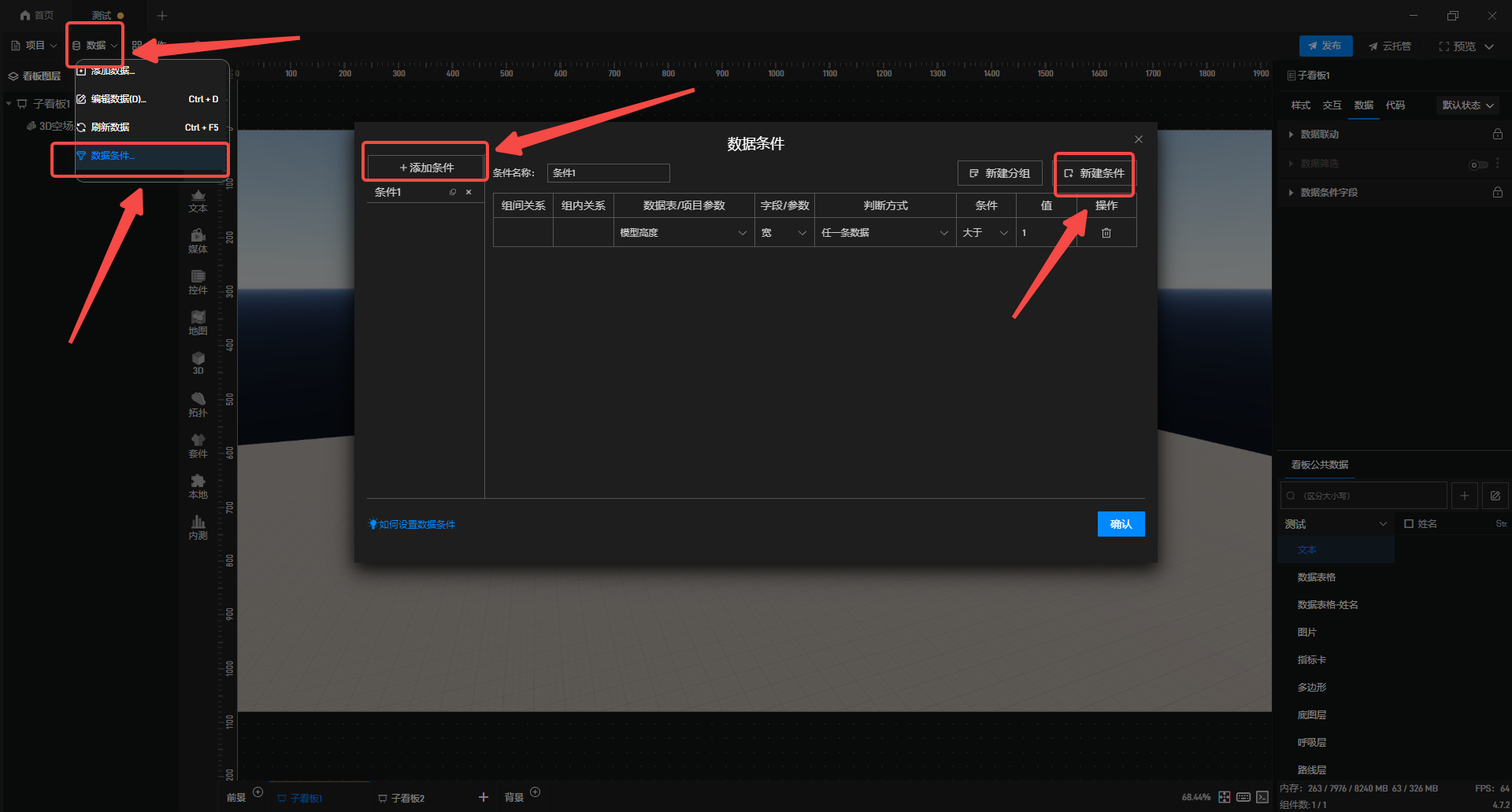 3.退出编辑状态后,在页面右上角选择“数据条件”,并添加所需判断的条件规则即可。