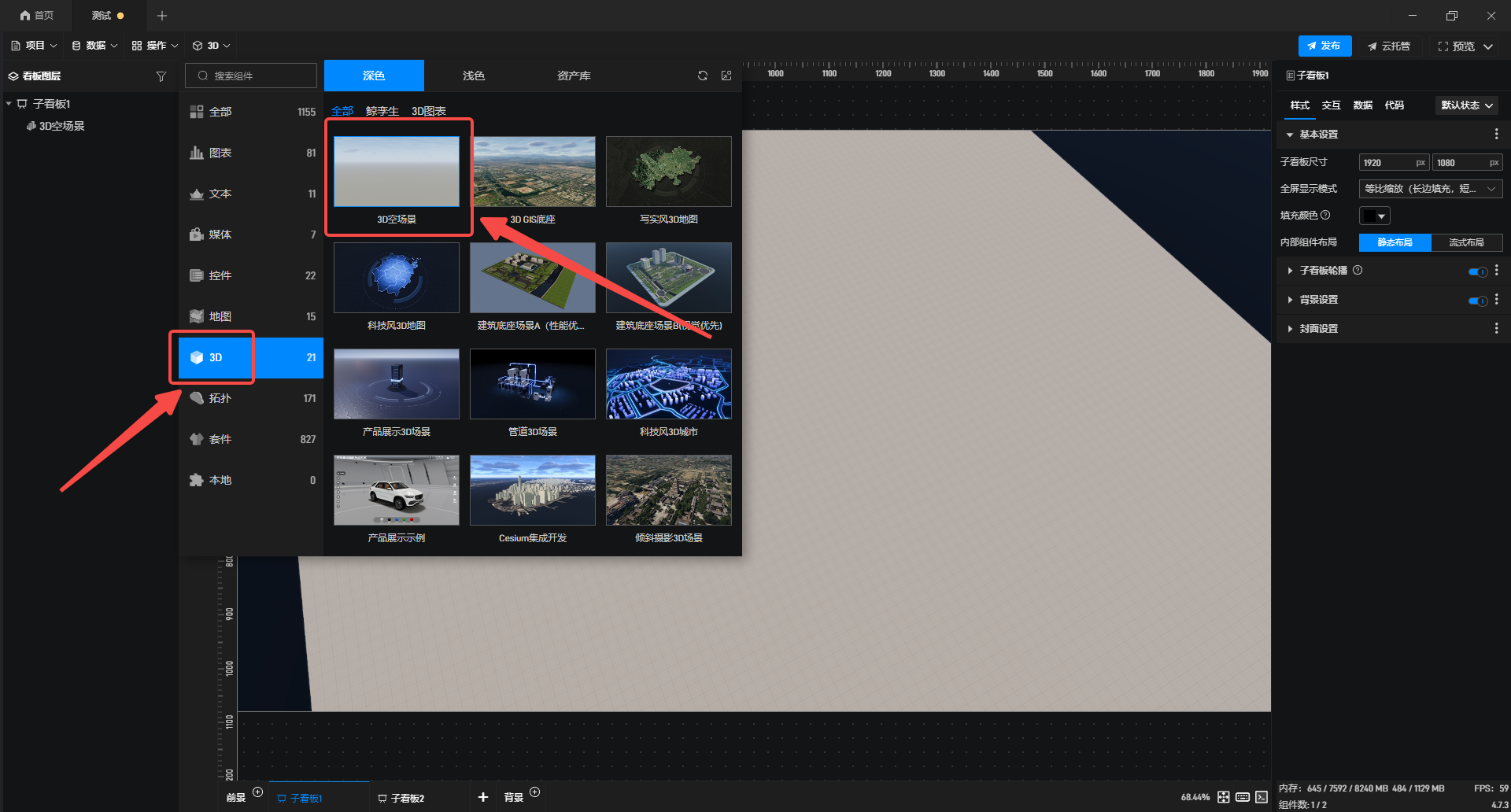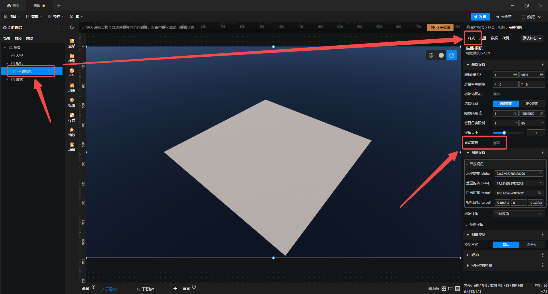 进入编辑界面,选中“鸟瞰相机”,在右侧“样式”配置栏,开启“自动旋转”选项。