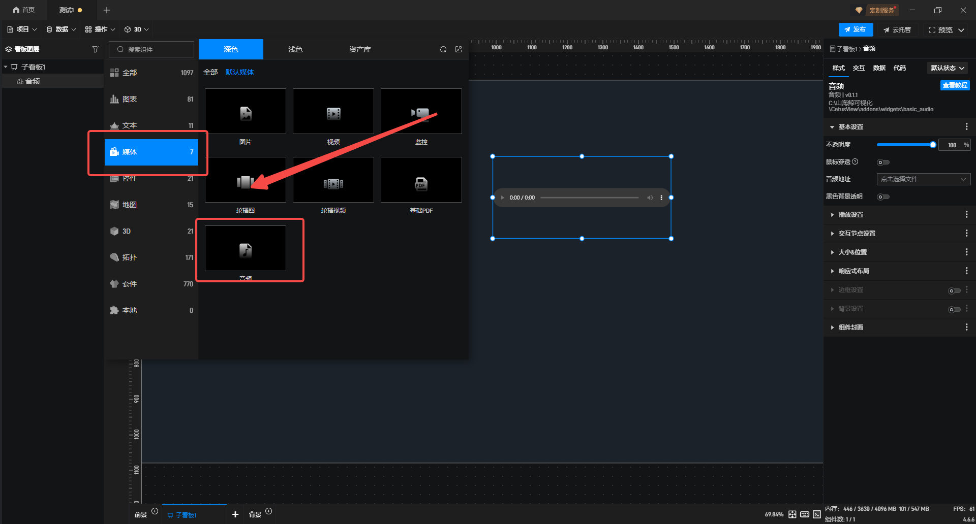 1.在“媒体”中添加音频组件。