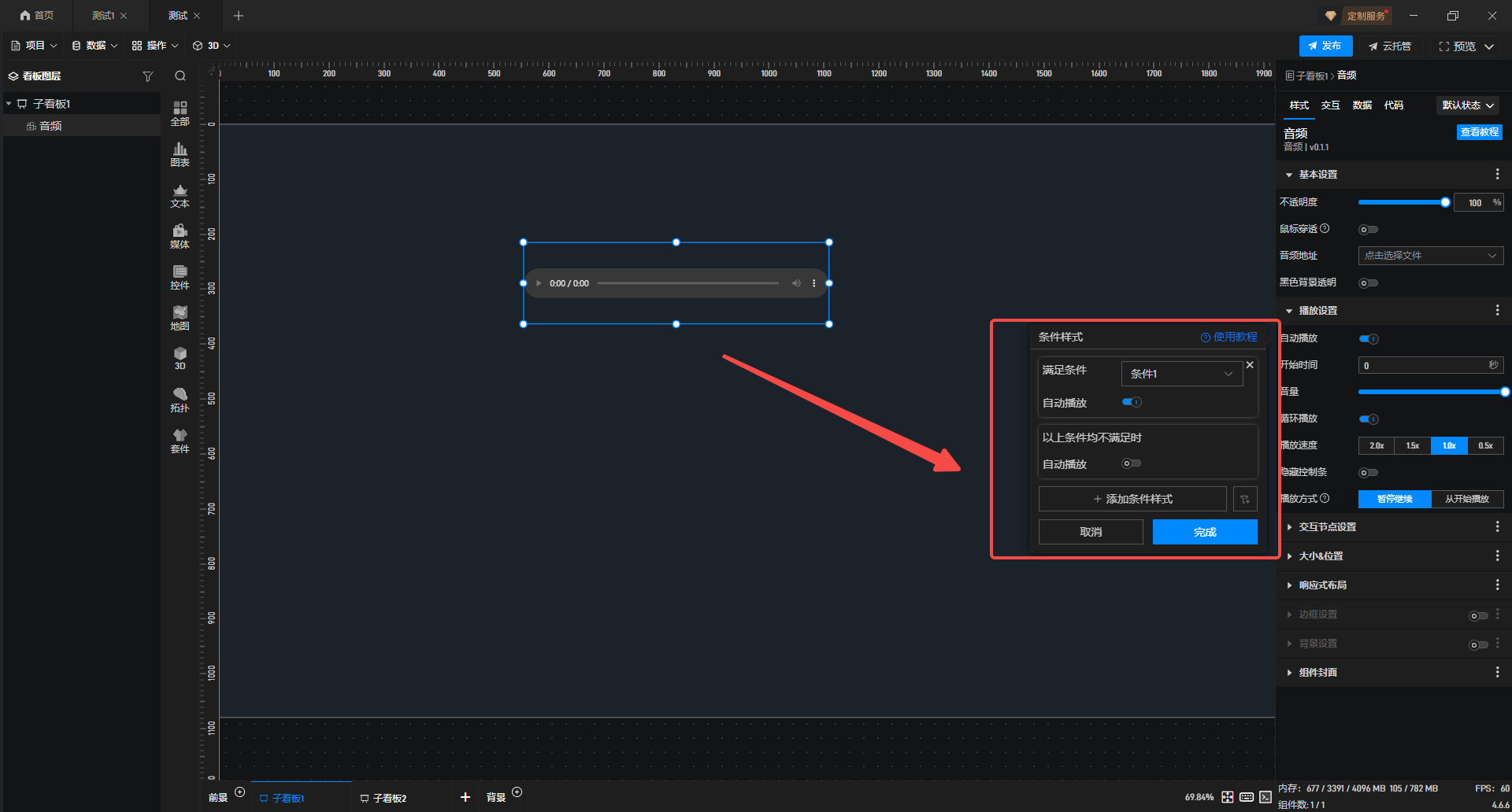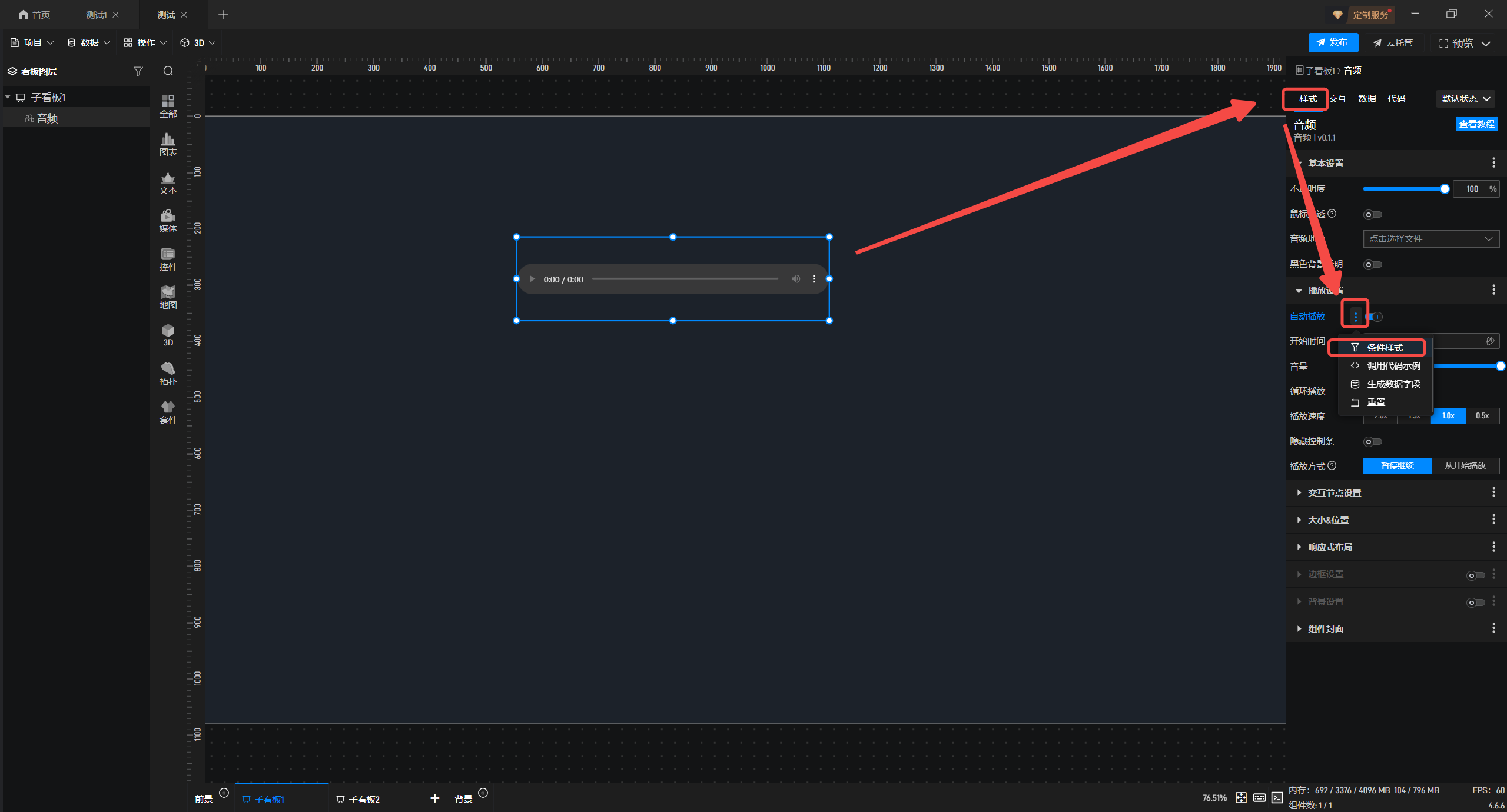 3.选中音频组件,在“样式”中开启“自动播放”,再进入“扩展样式”,点击“条件样式”。