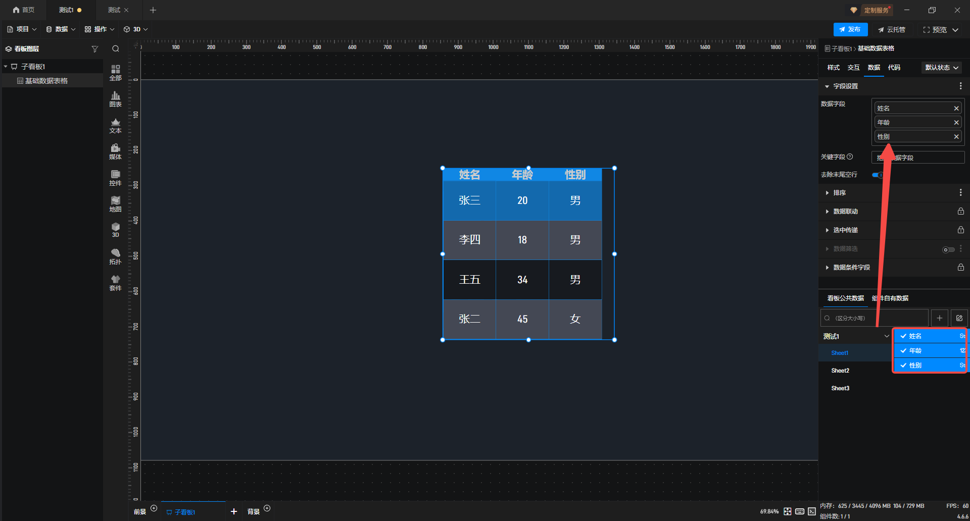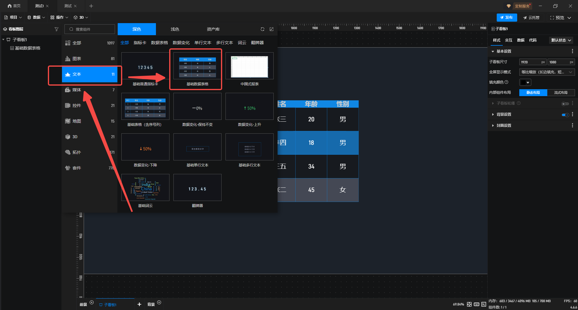 1.在左侧组件库中选择“基础数据表格”组件,添加到项目中。