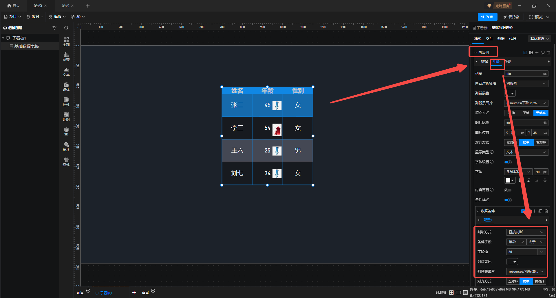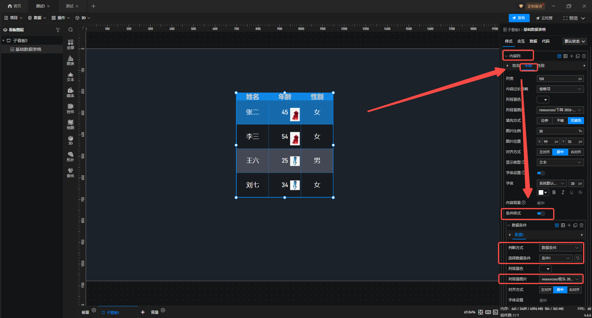4.完成上述操作后,继续打开“条件样式”,“判断方式”选择“数据条件”,“选择数据条件”为“条件1”,勾选“列背景图片”,此处图片是依据数据条件判定后展示的对应样式。