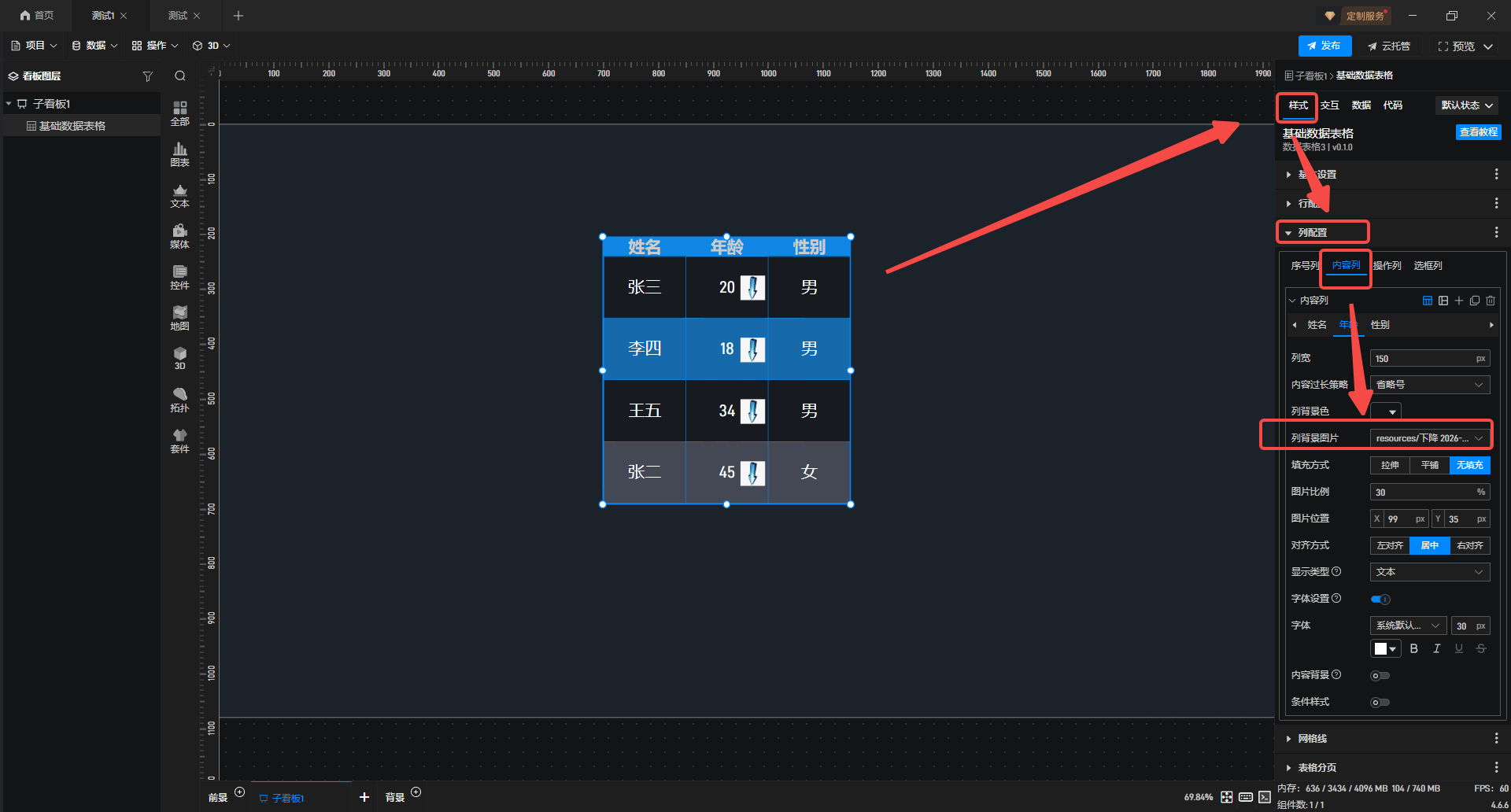 3. 选中数据表格,选择“样式”进入“列配置”,找到“内容列”后选择需做判断的字段,最后在“列背景图片”中选择对应展示的图片,此处图片是未依据数据条件判定后展示的对应样式。