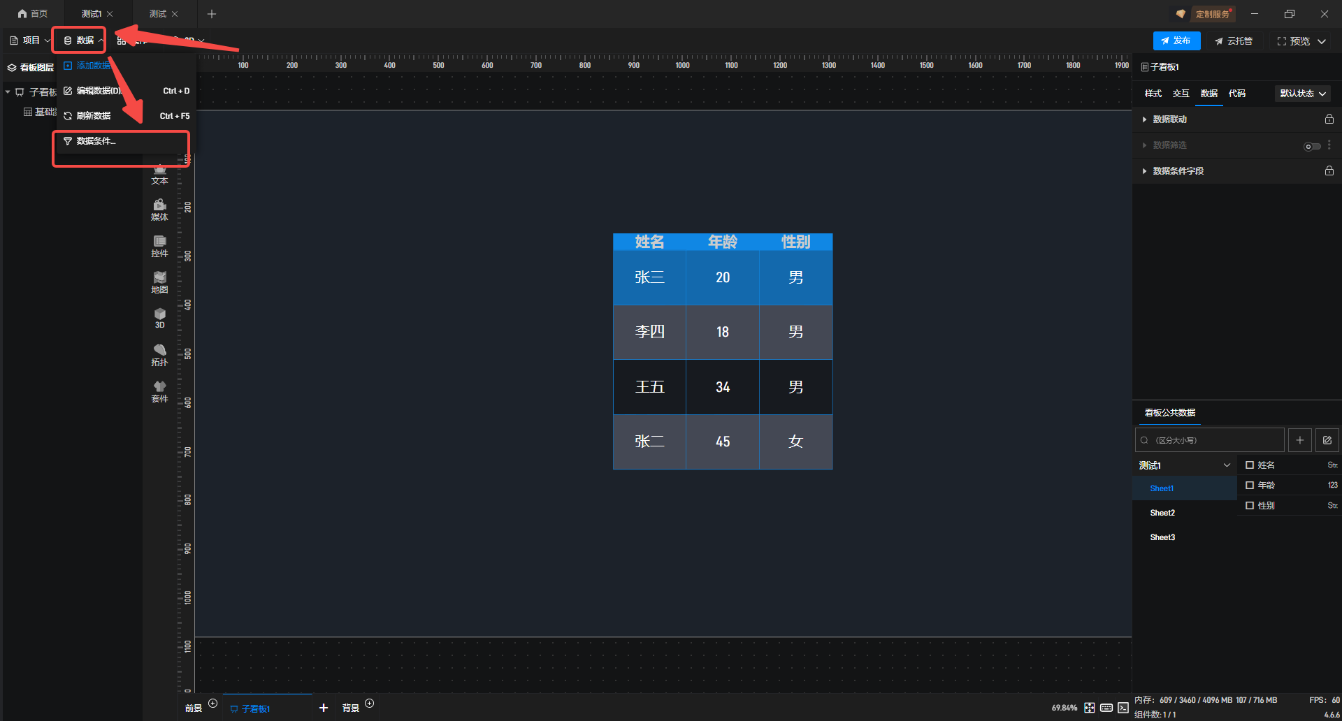 2.在左上角,选择“数据”添加“数据条件”。