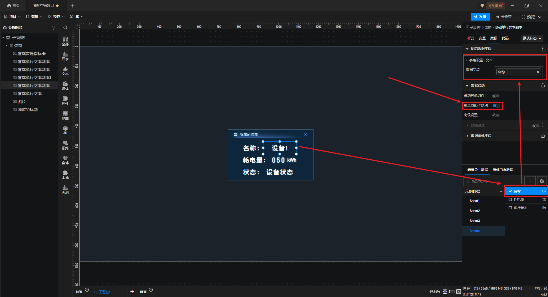 6. 将数据字段添加进去,同时开启“受其他组件联动”,其余几个需要产生变化的数据同样依此进行设置。