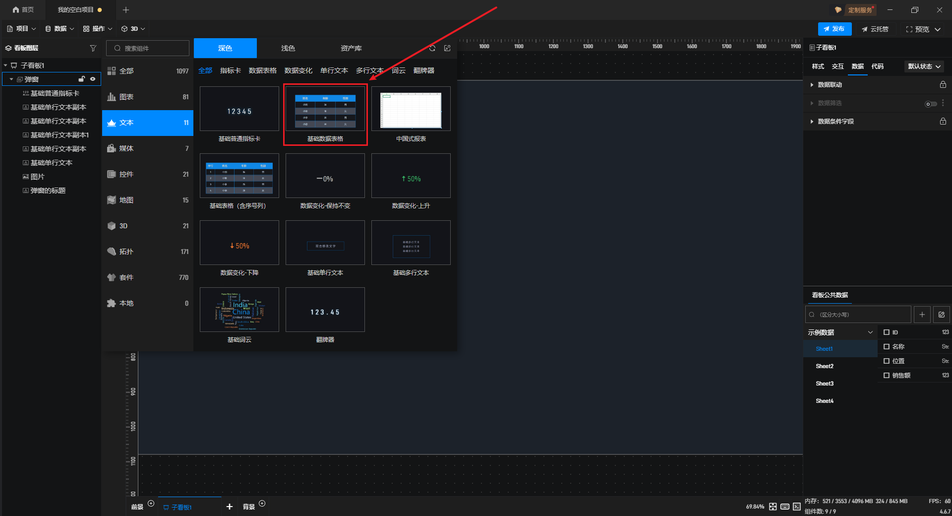 7. 关闭弹窗,添加一个“基础数据表格”组件。