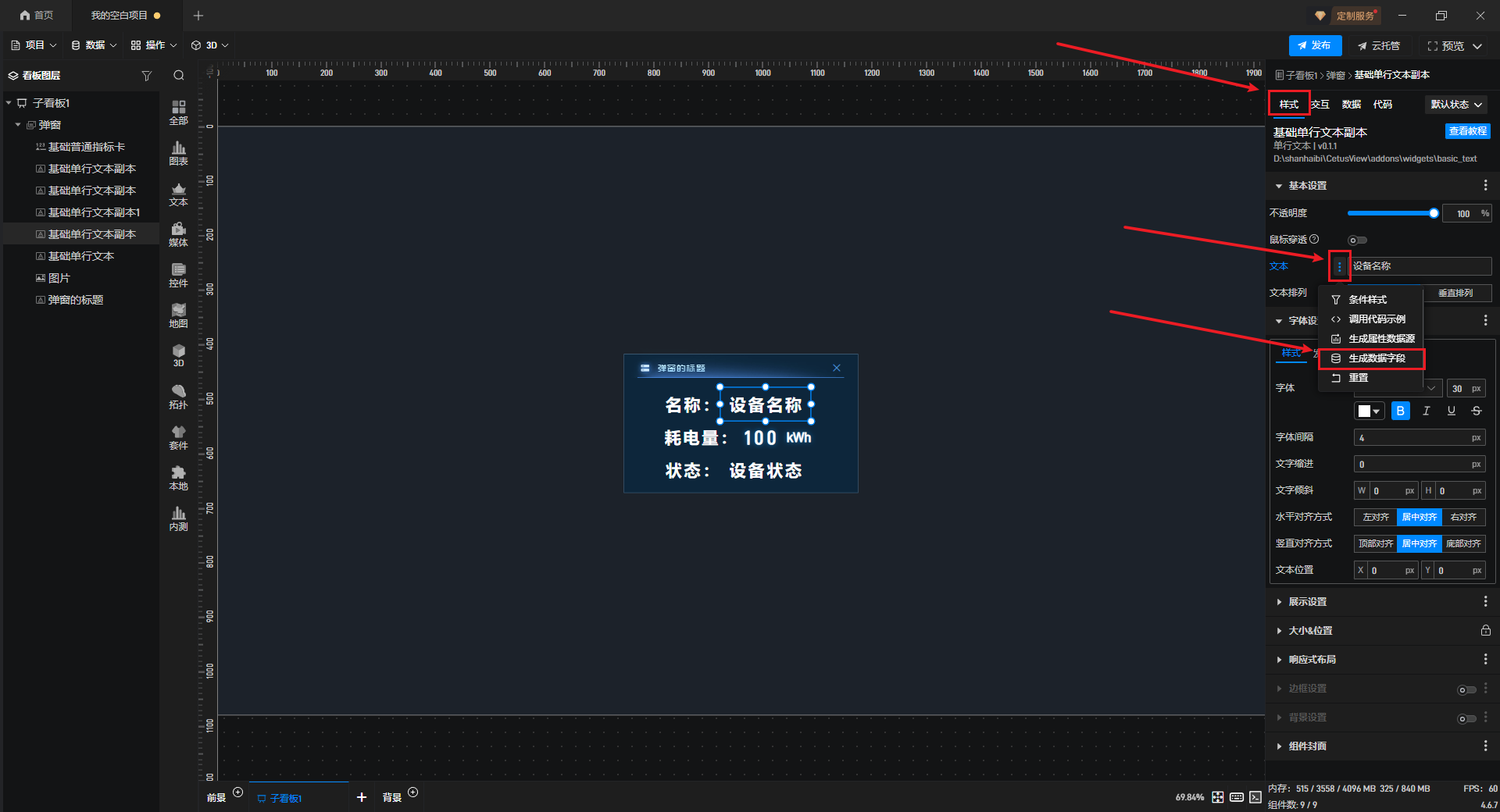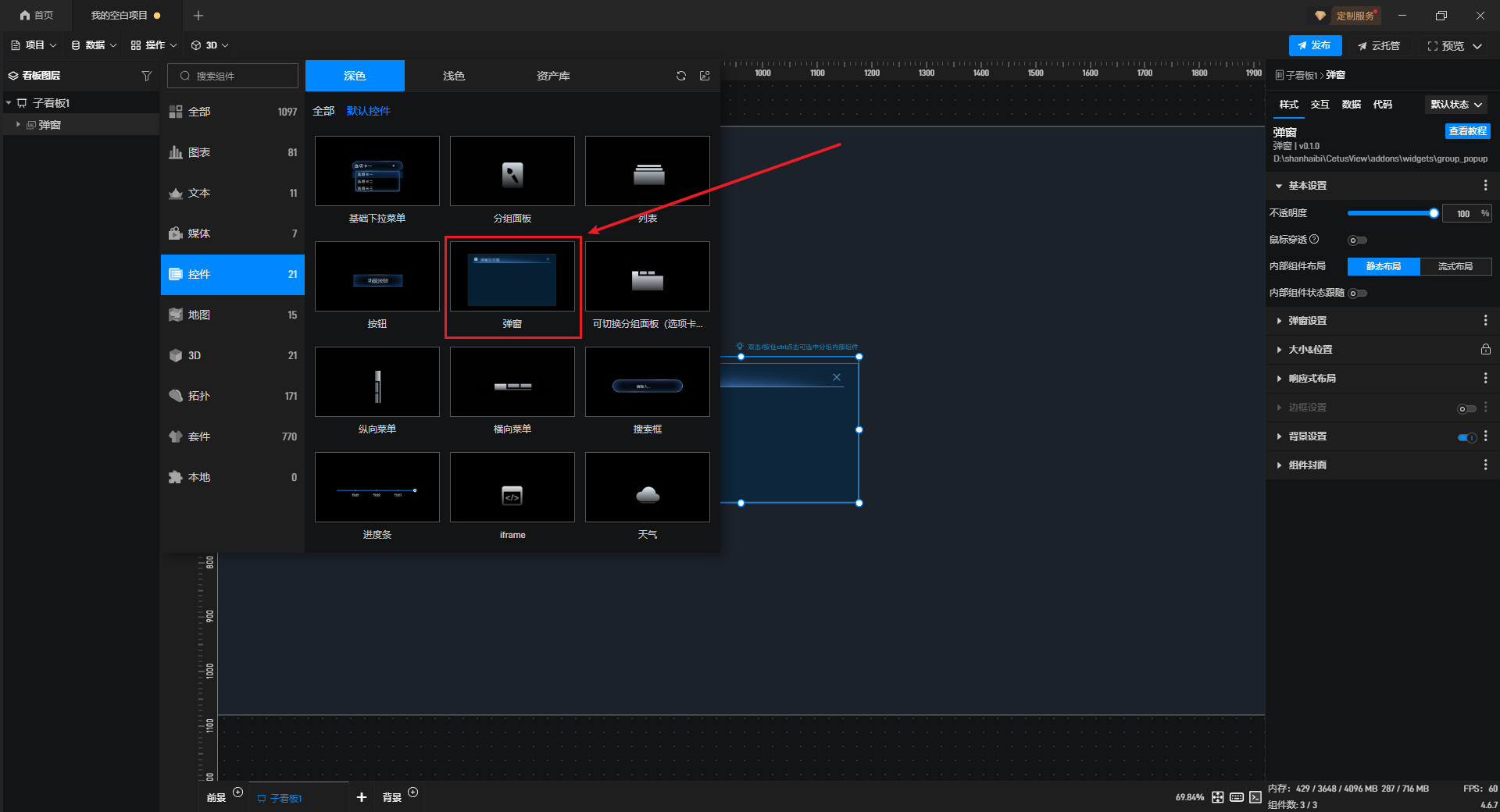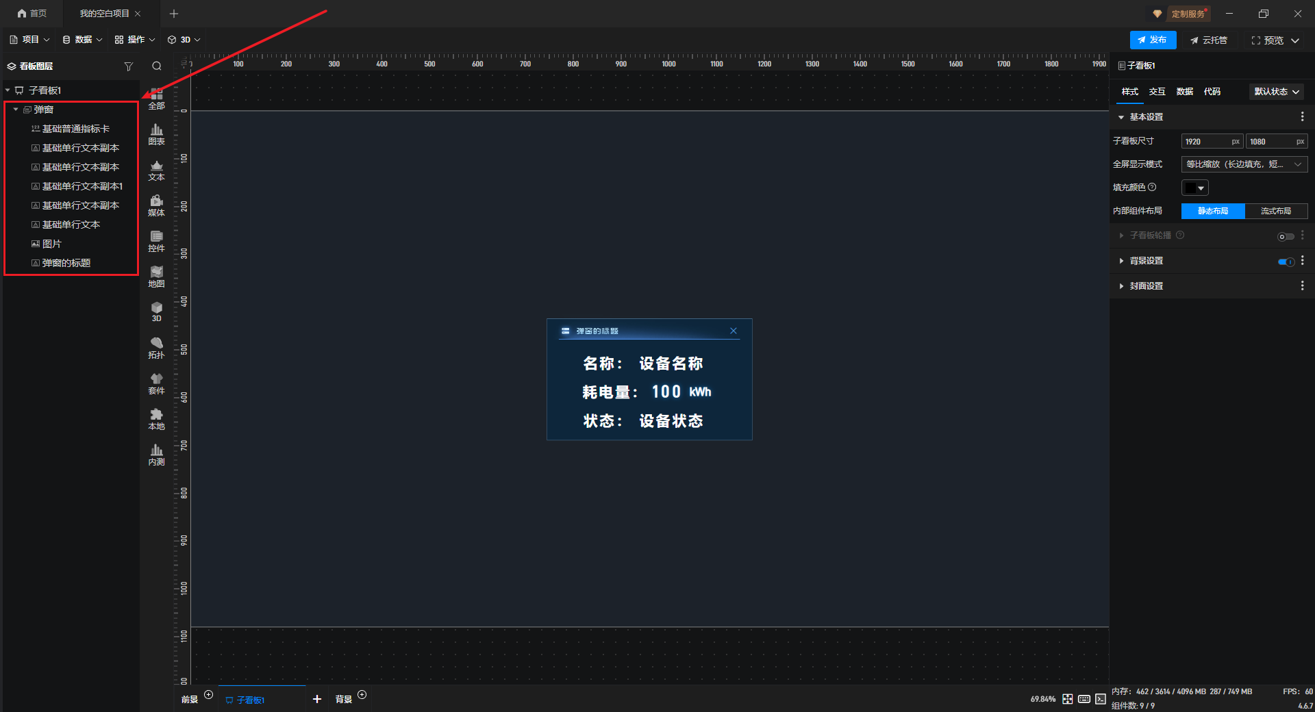 4. 同时,根据需要添加“单行文本”组件和“指标卡”组件填充弹窗内容。