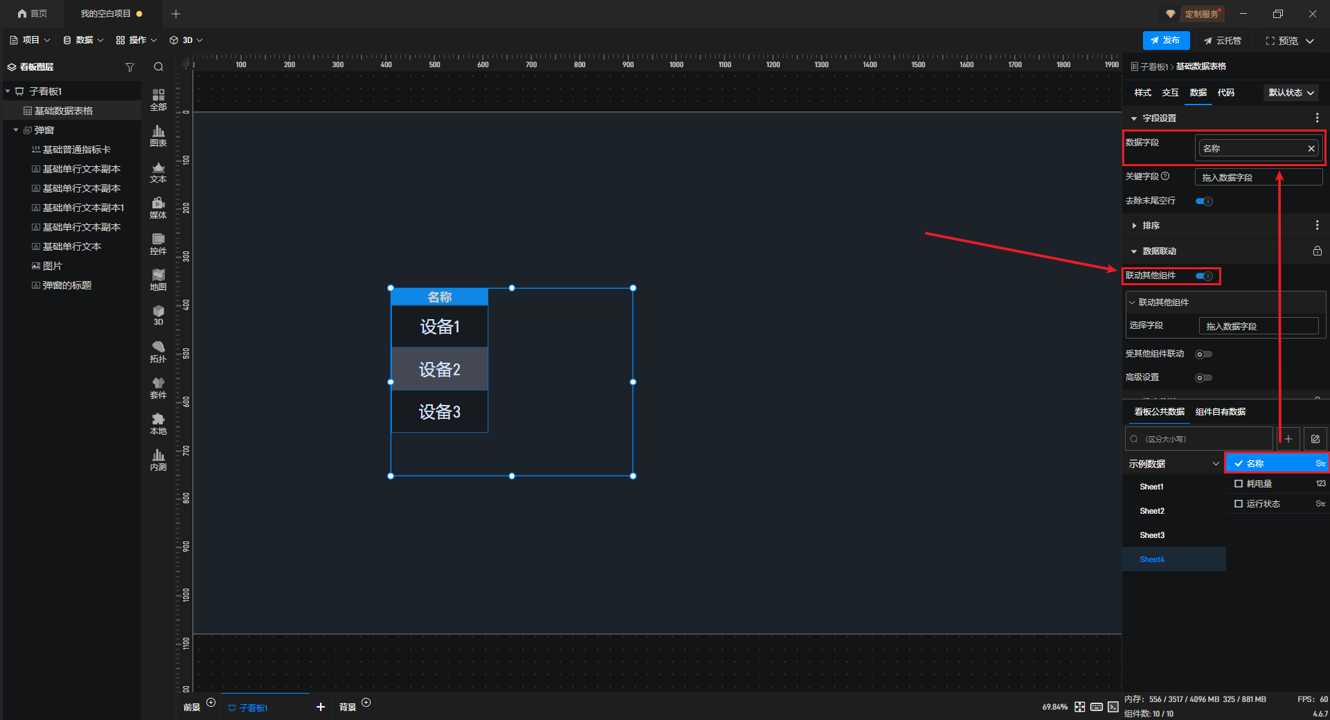 8. 设置“基础数据表格”组件的数据字段,并开启“联动其他组件”。