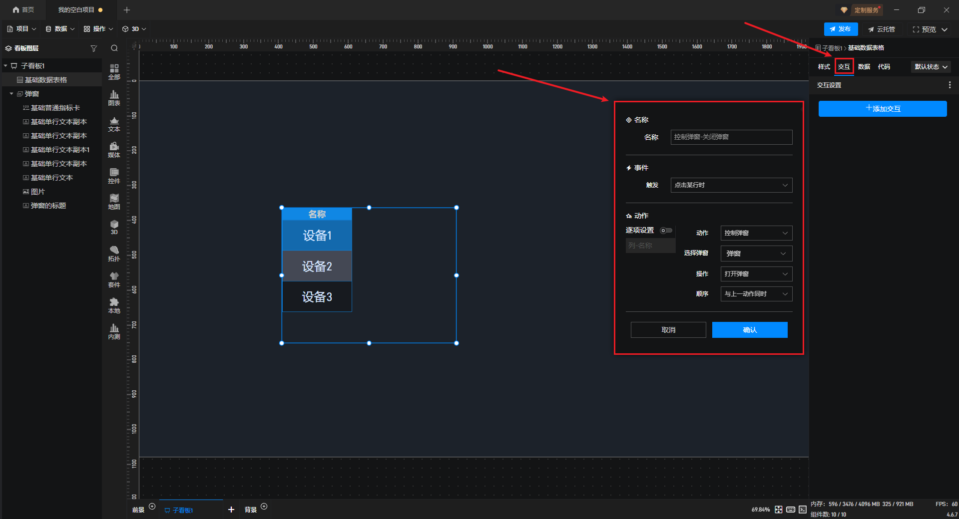 9. 切换到“交互”设置,为“基础数据表格”组件设置打开弹窗的交互,如下图所示: