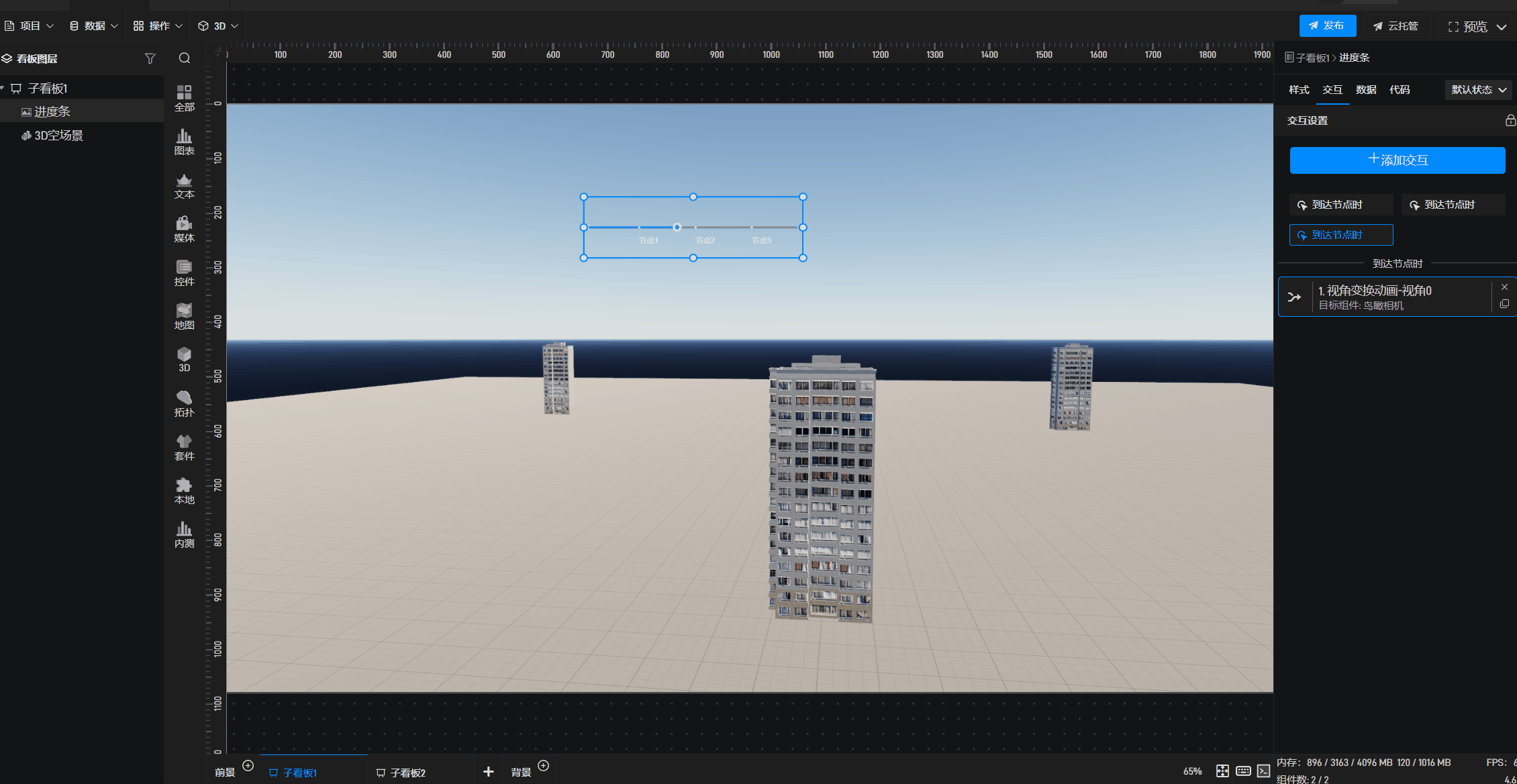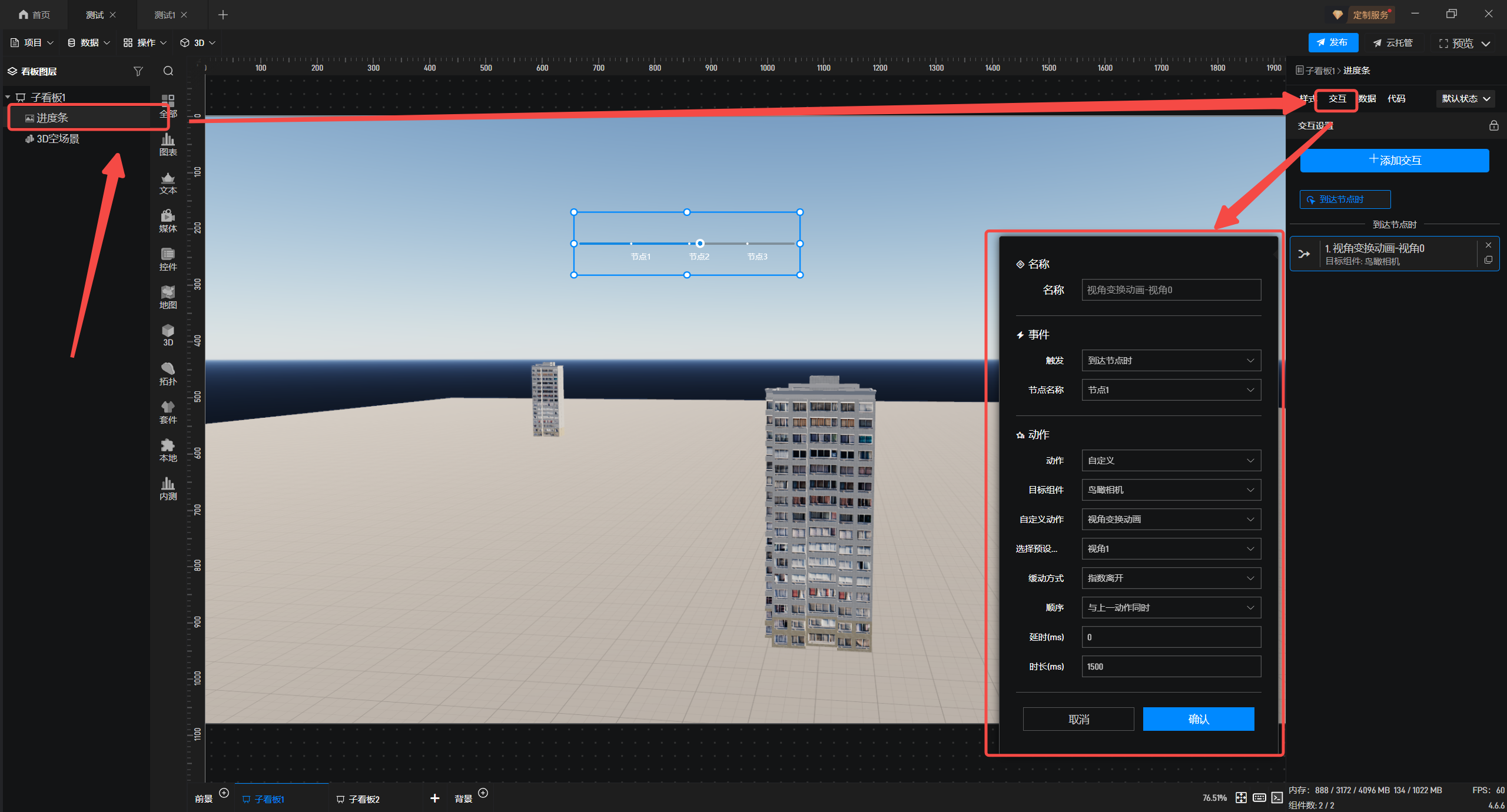 5.选择进度条,添加“交互”,触发“到达节点时”事件,“节点名称”为“节点1”,“动作”为“自定义”,“目标组件”选择“鸟瞰相机”,“自定义动作”选择“视角变换动画”,“选择预设视角”为“视角1”,“时长”可以根据需求进行更改,节点 2、节点 3 按相同方法设置,对应选择视角 2、视角 3 即可。
