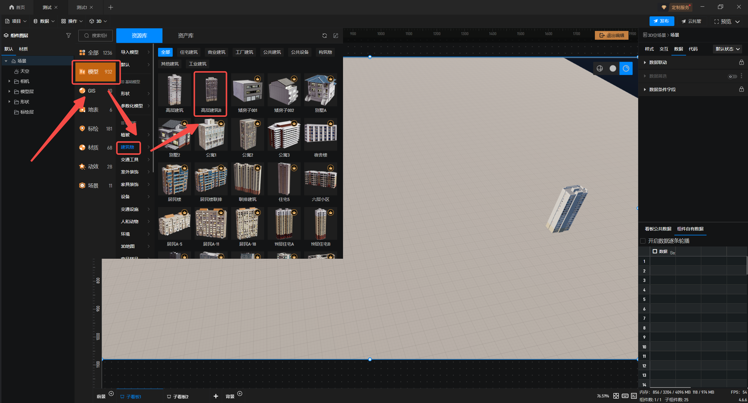 2.双击进入编辑界面,在“模型”选项中选择“建筑物”或者其他三维模型,将其添加至场景。