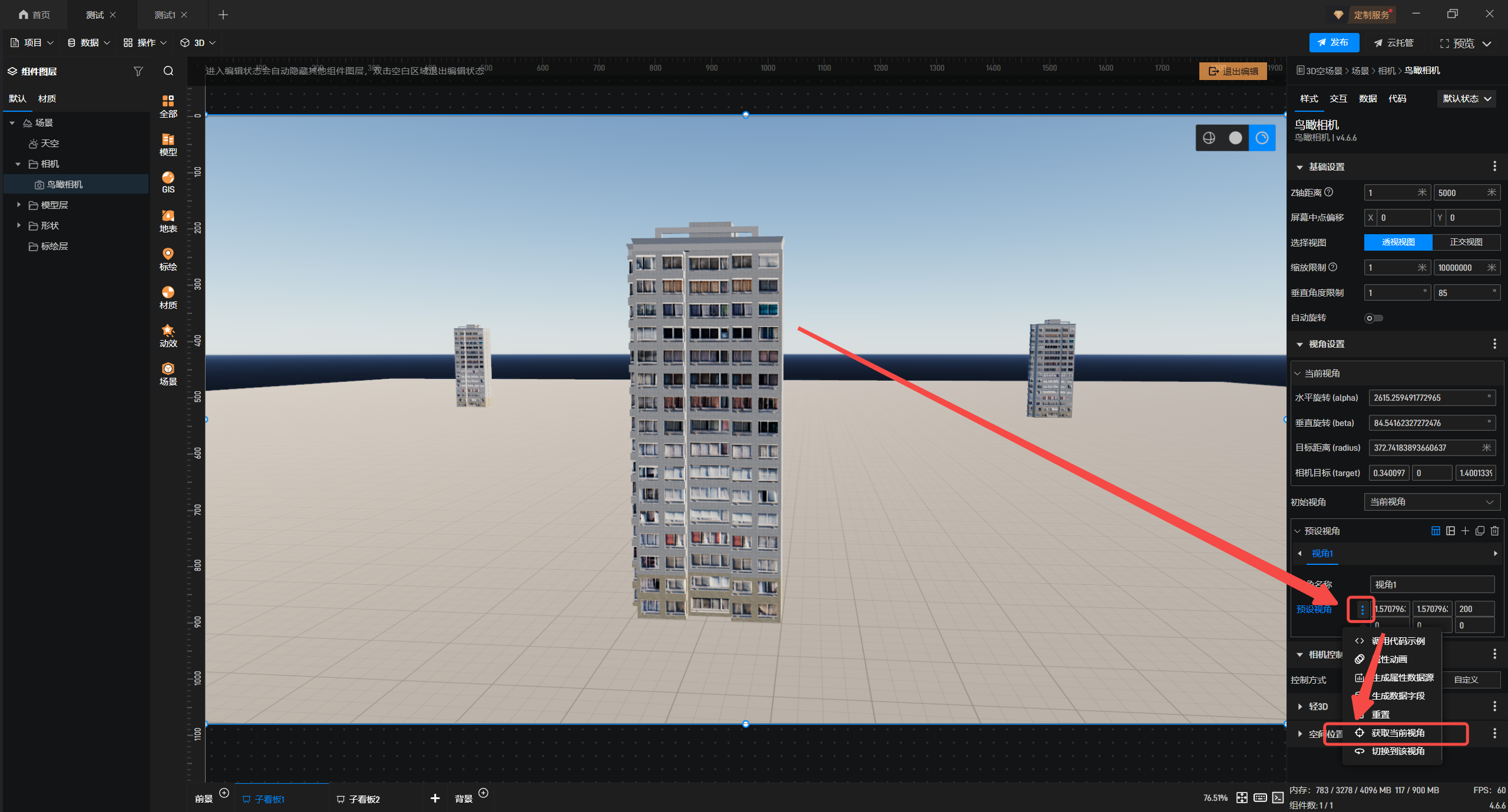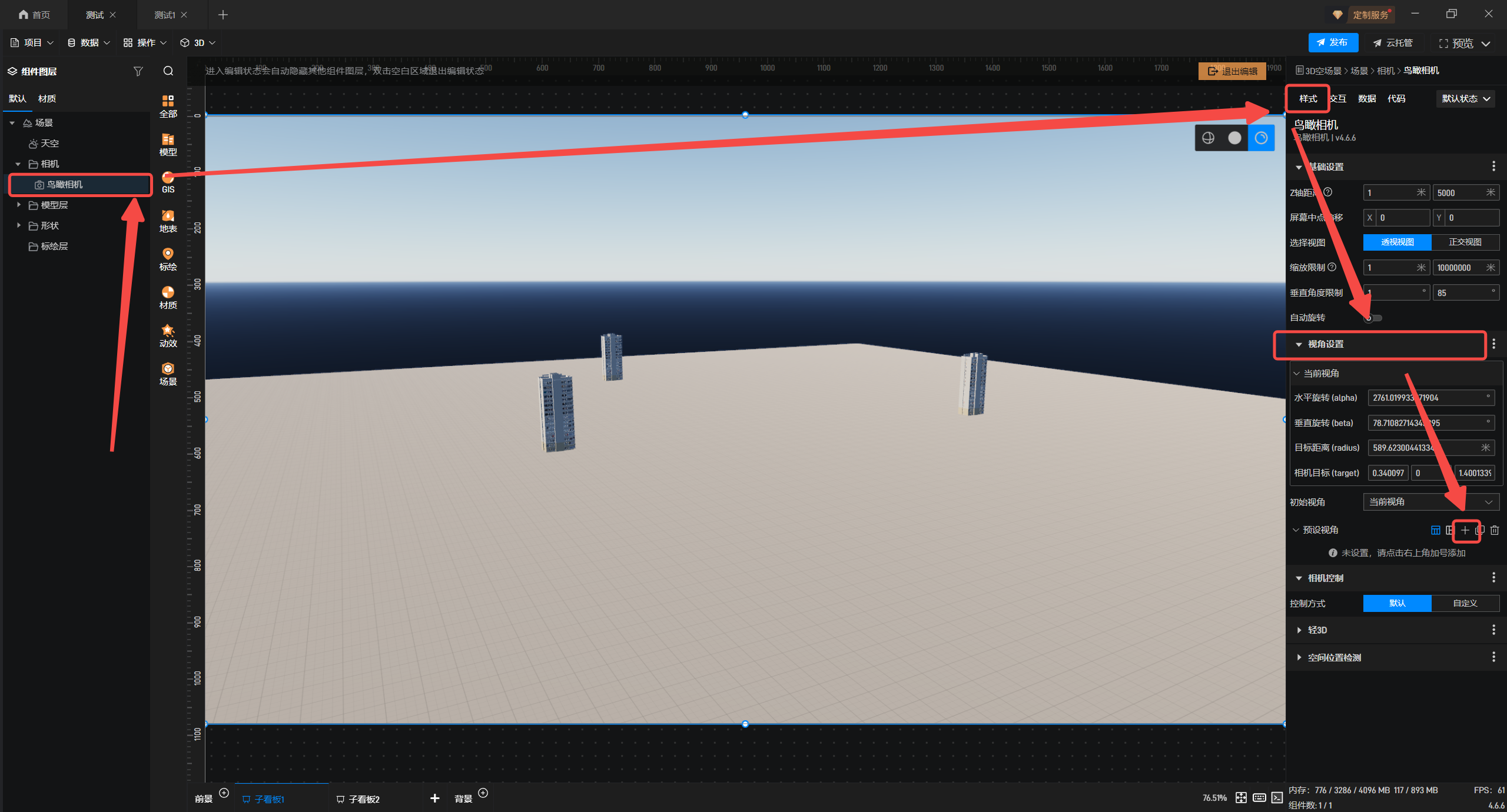 3.选中“鸟瞰相机”,在“样式”中进入“视角设置”,添加“预设视角”。