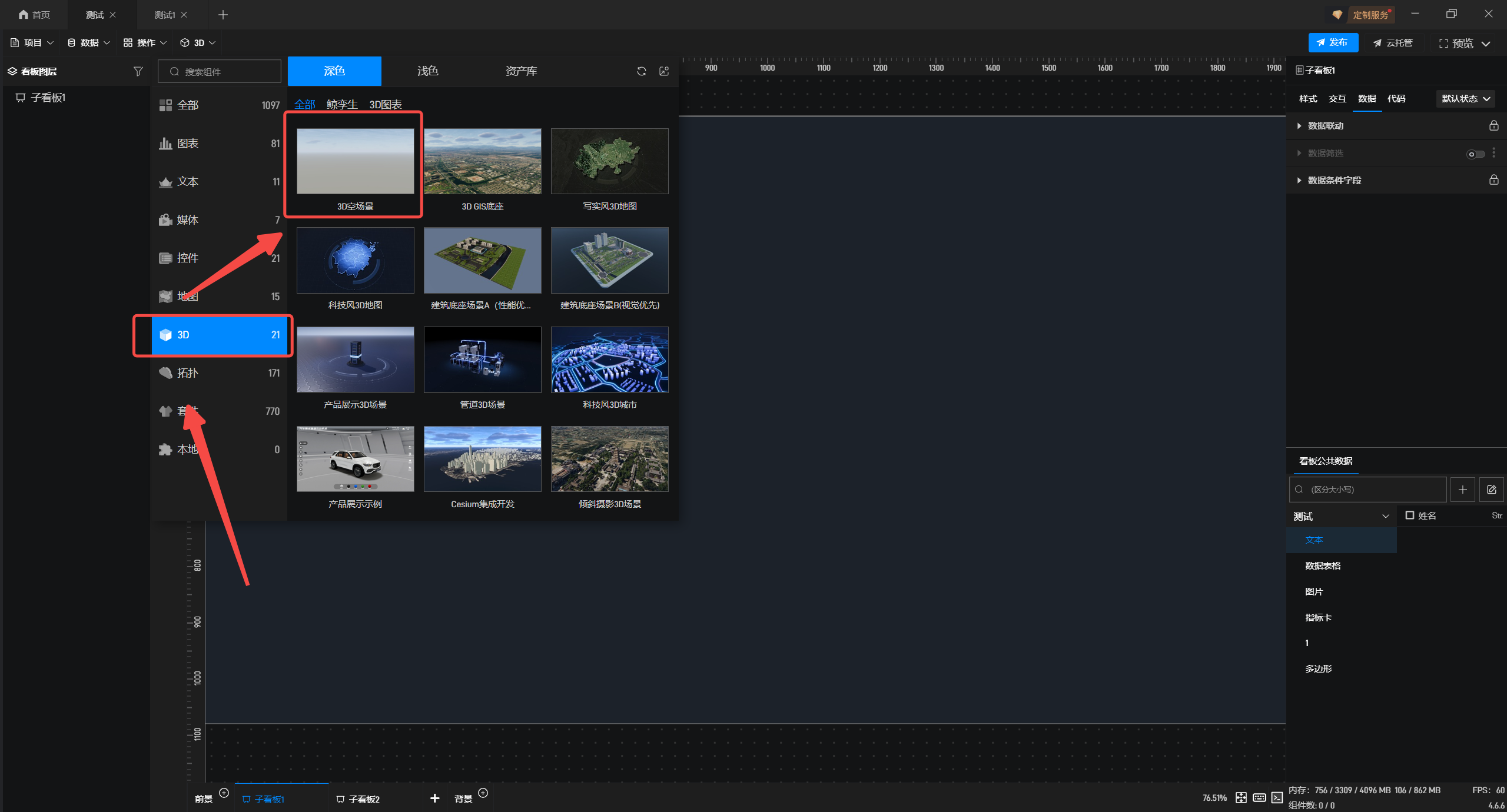 1.在左侧组件库添加“3d空场景”至项目中。
