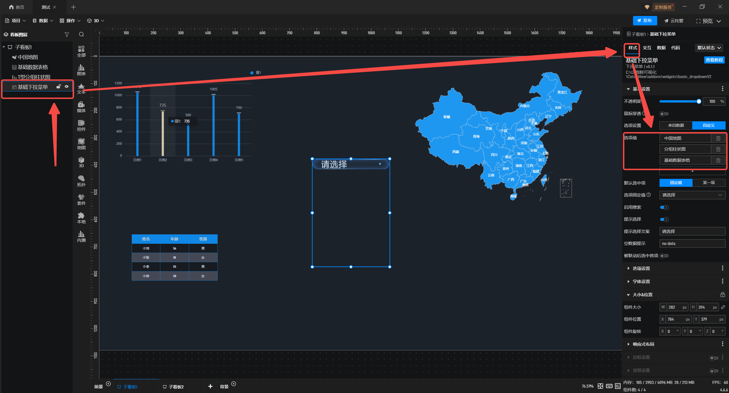 2.选中下拉菜单,在“数据”配置栏中,勾选数据至组件中。