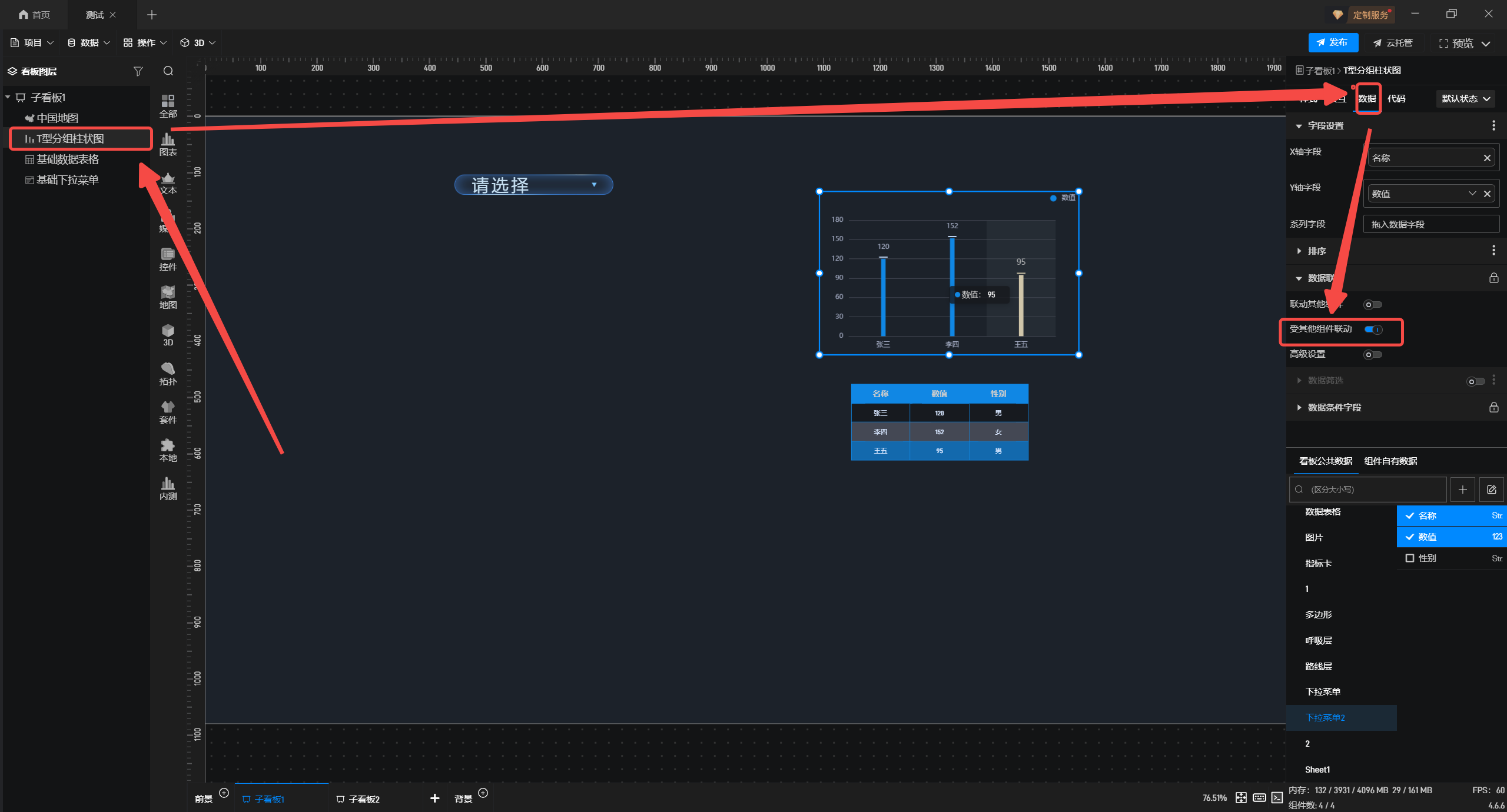 同样选中T型分组柱状图,在“数据”配置栏,开启“受其他组件联动”。