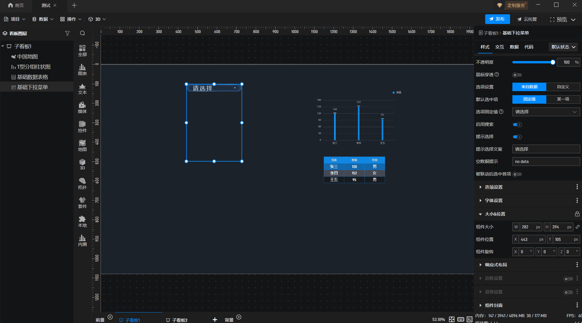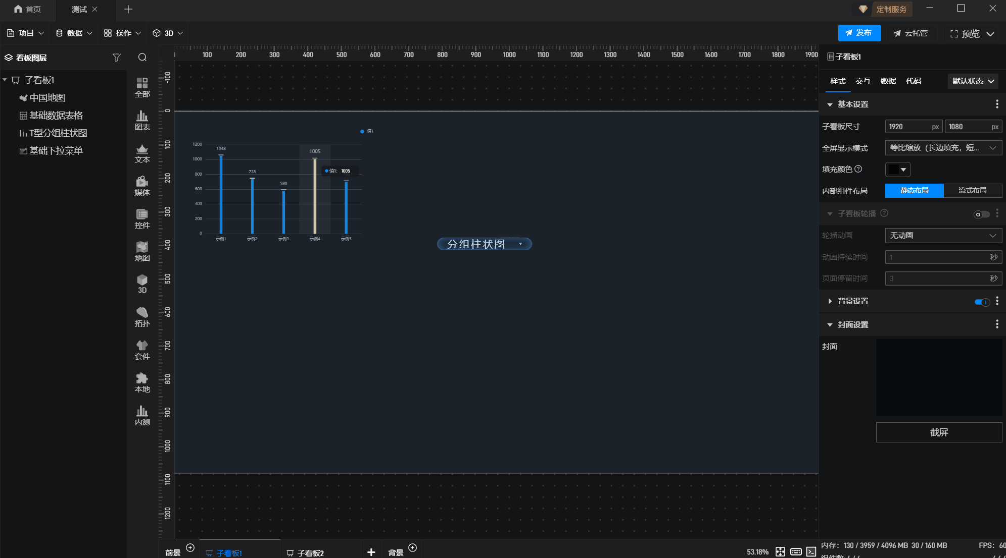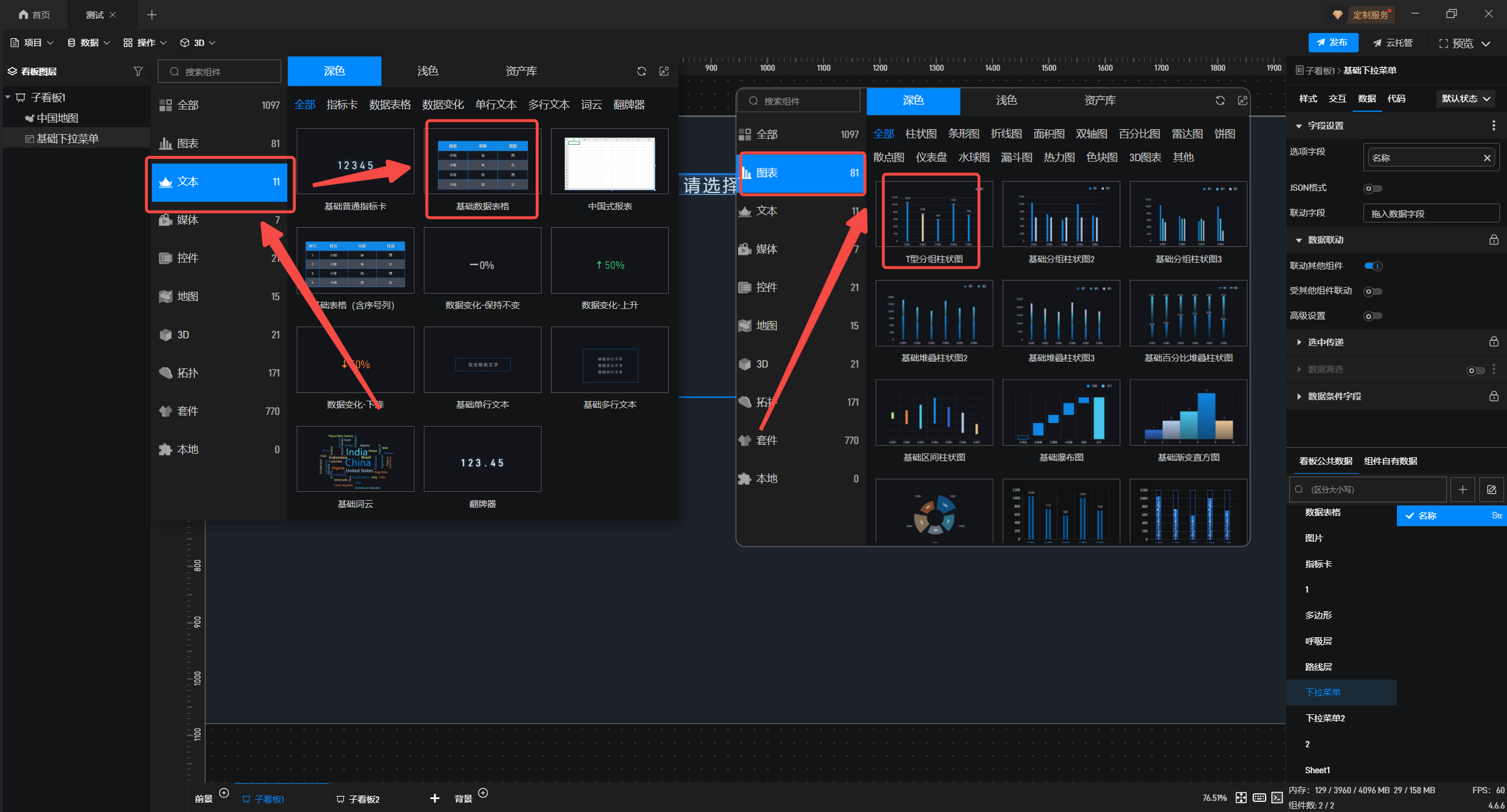 3.在左侧组件库添加“T型分组柱状图”和“基础数据表格”组件。