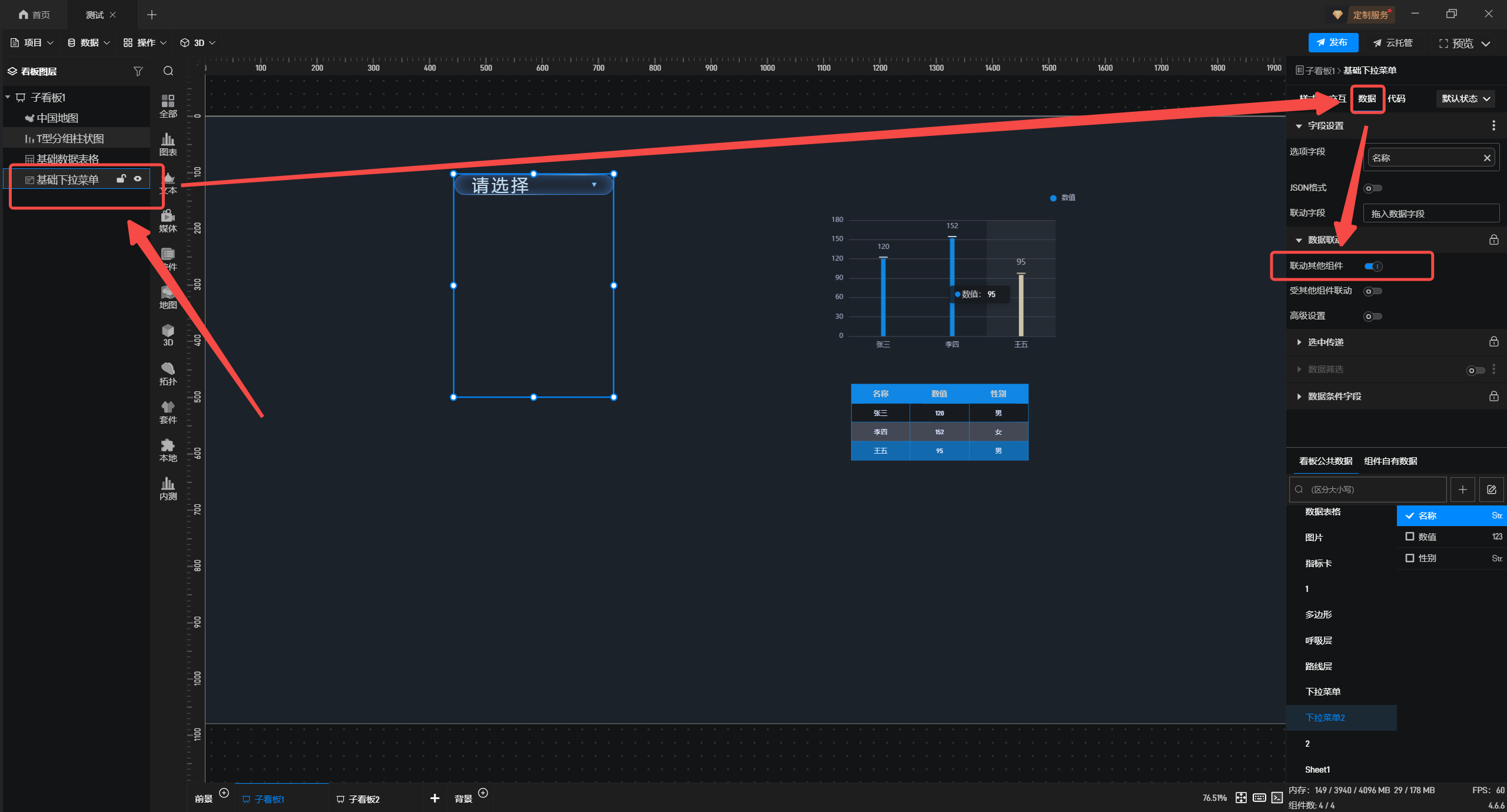 4.选中下拉菜单,在“数据”配置栏中,开启“联动其他组件”。