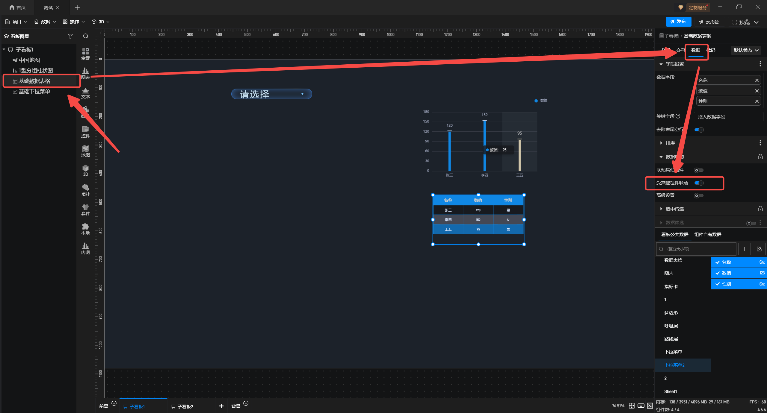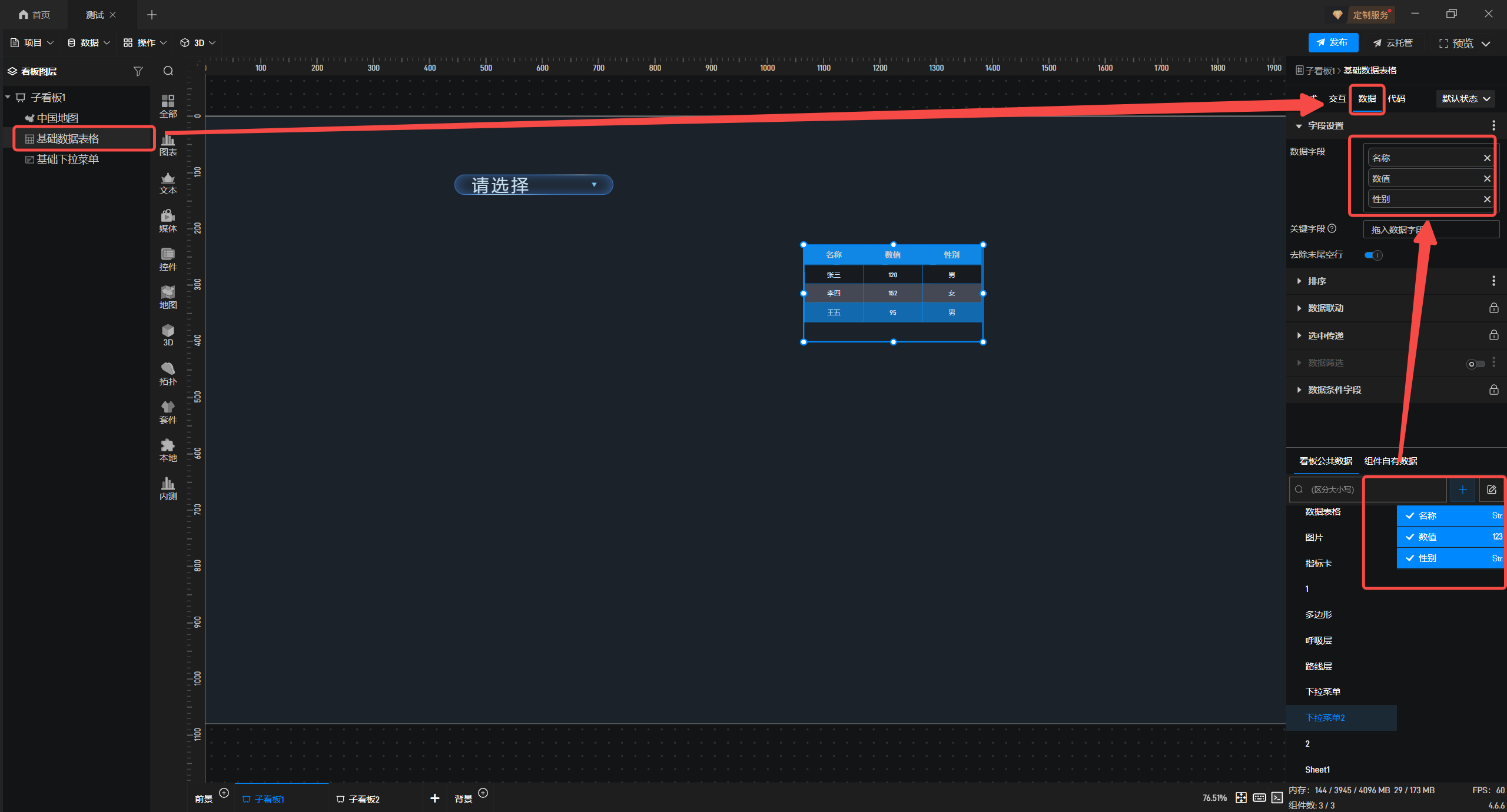 接着选中基础数据表格,在“数据”配置栏中,勾选数据至组件中。