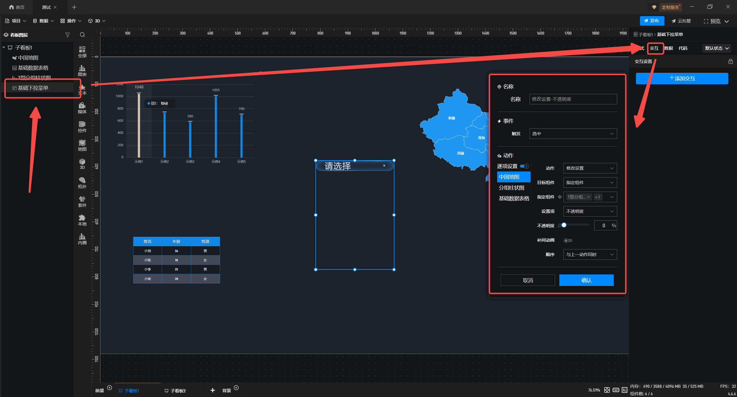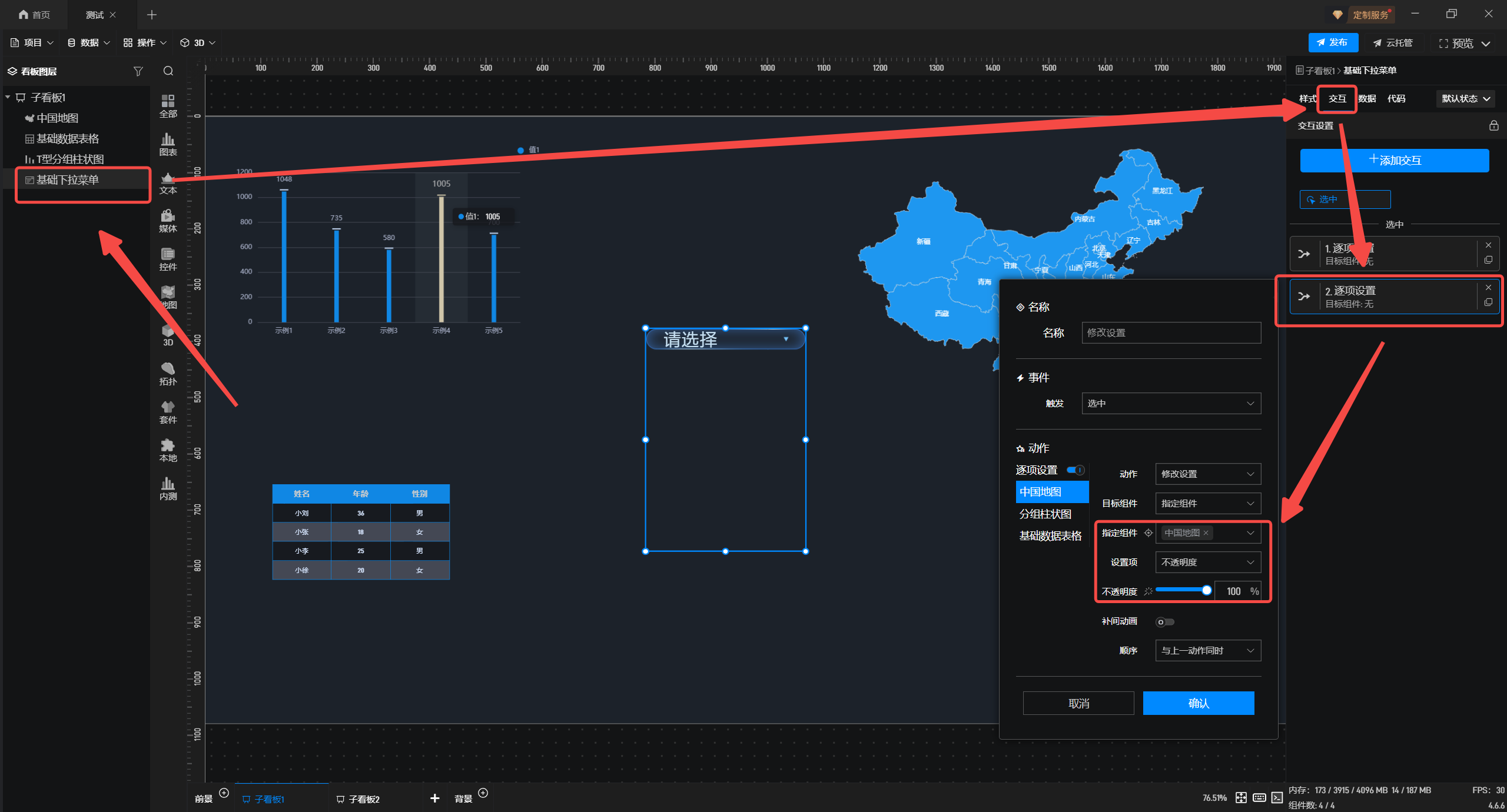 3.选中下拉菜单组件添加“交互”,触发“选中事件”, 将“动作”开启“逐项设置”;选中“中国地图”,“动作”为“修改设置”,”目标组件”选择“指定组件”且“指定组件”为除中国地图外的其他组件,同时将”设置项”改为”不透明度”,并将“不透明度”设为 “0%”,其他组件依次类推。