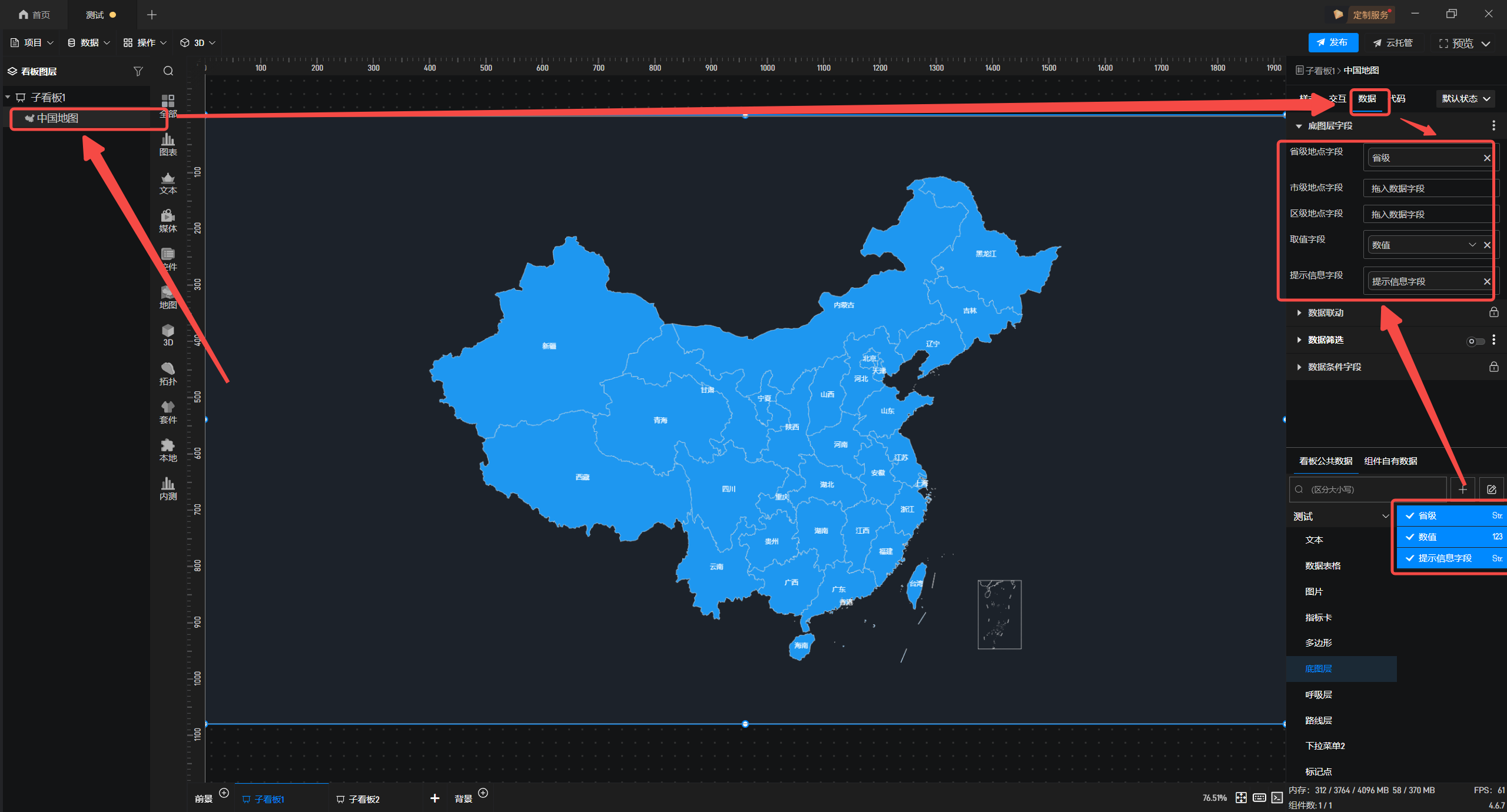 接着选中中国地图,在右侧“数据”配置面板中,勾选相关数据。