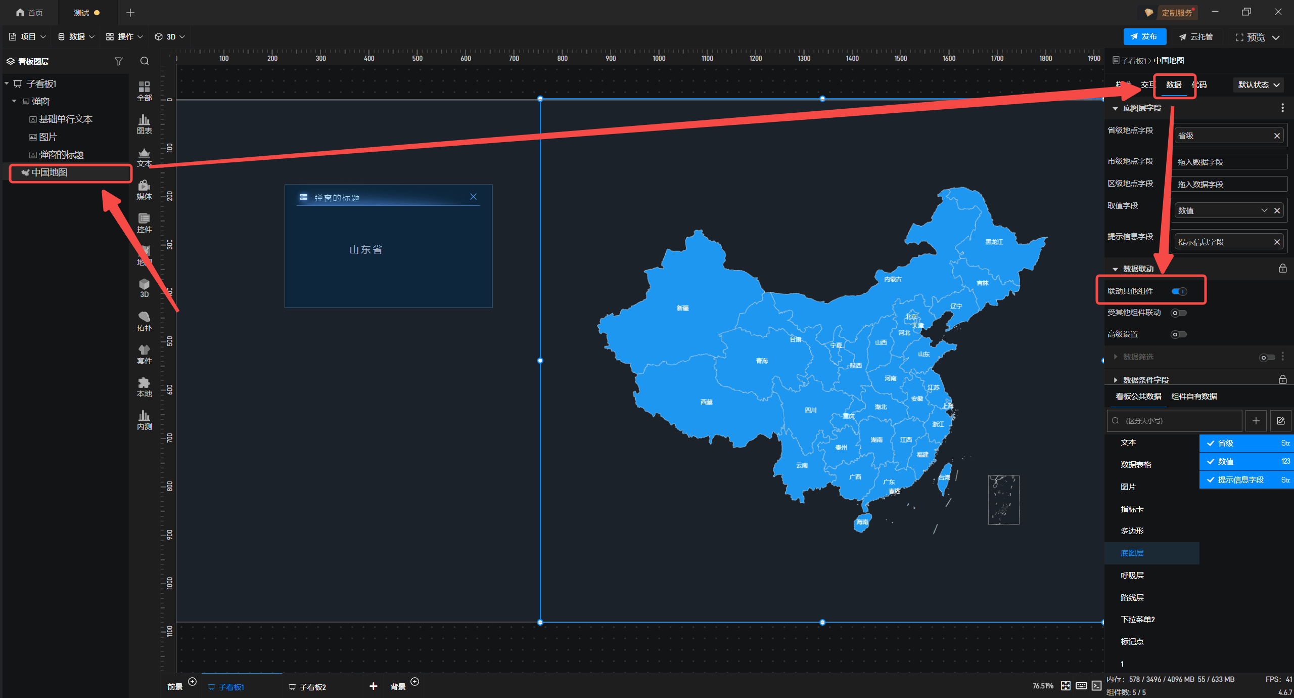 4.选中中国地图组件,在“数据”配置面板中启用“联动其他组件”功能。