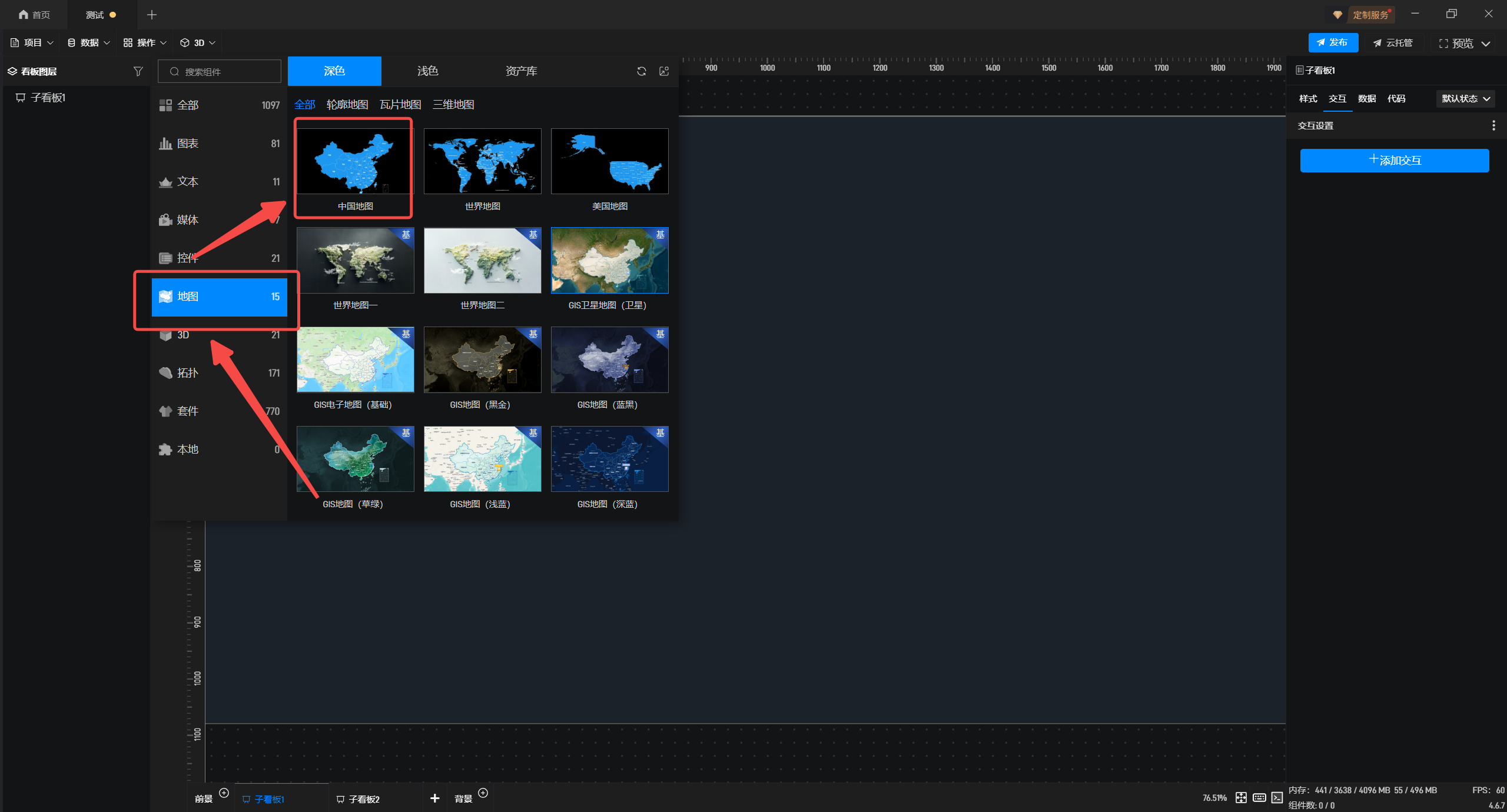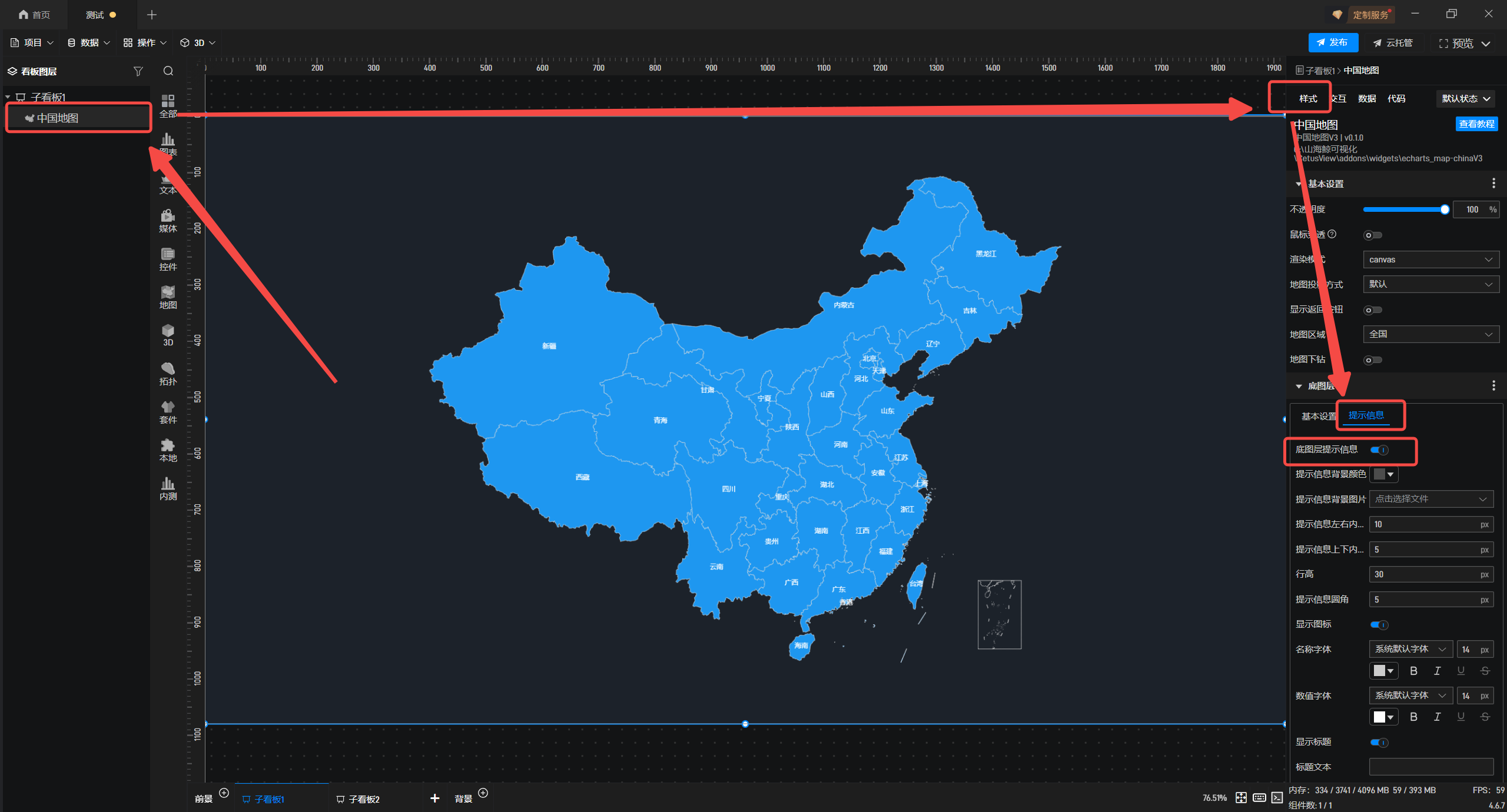 1.在左侧组件库添加“中国地图”组件至项目中。
