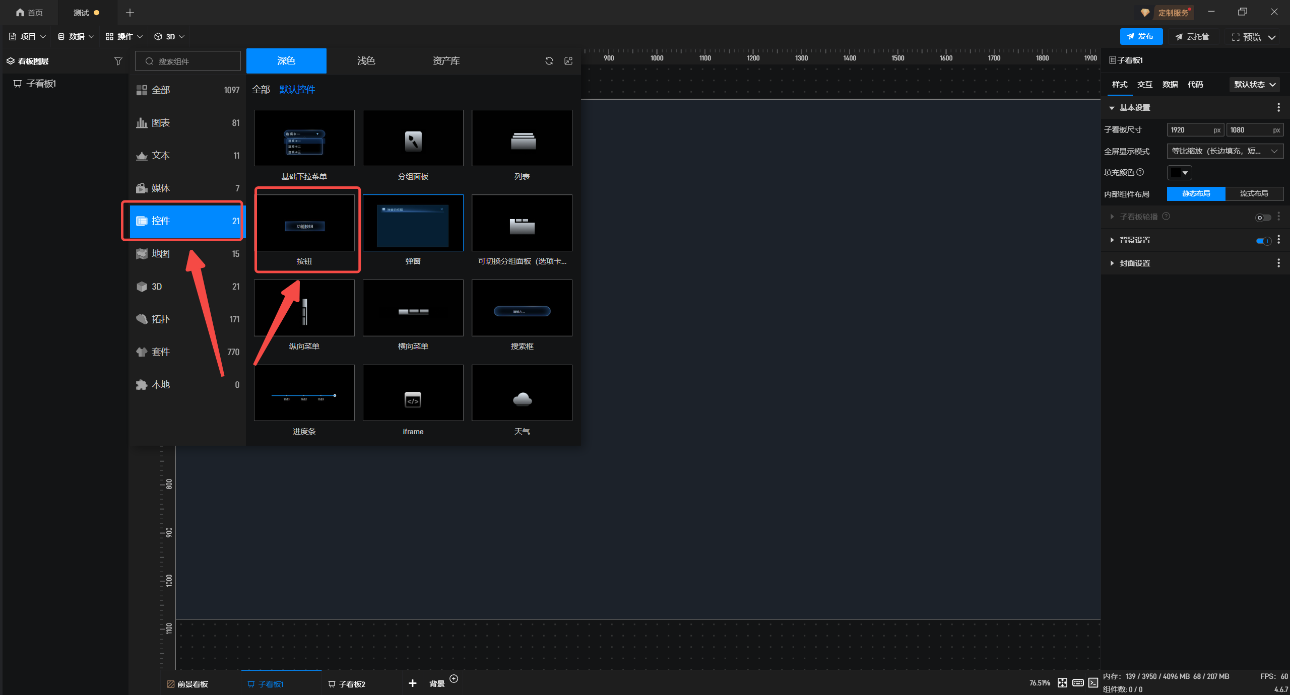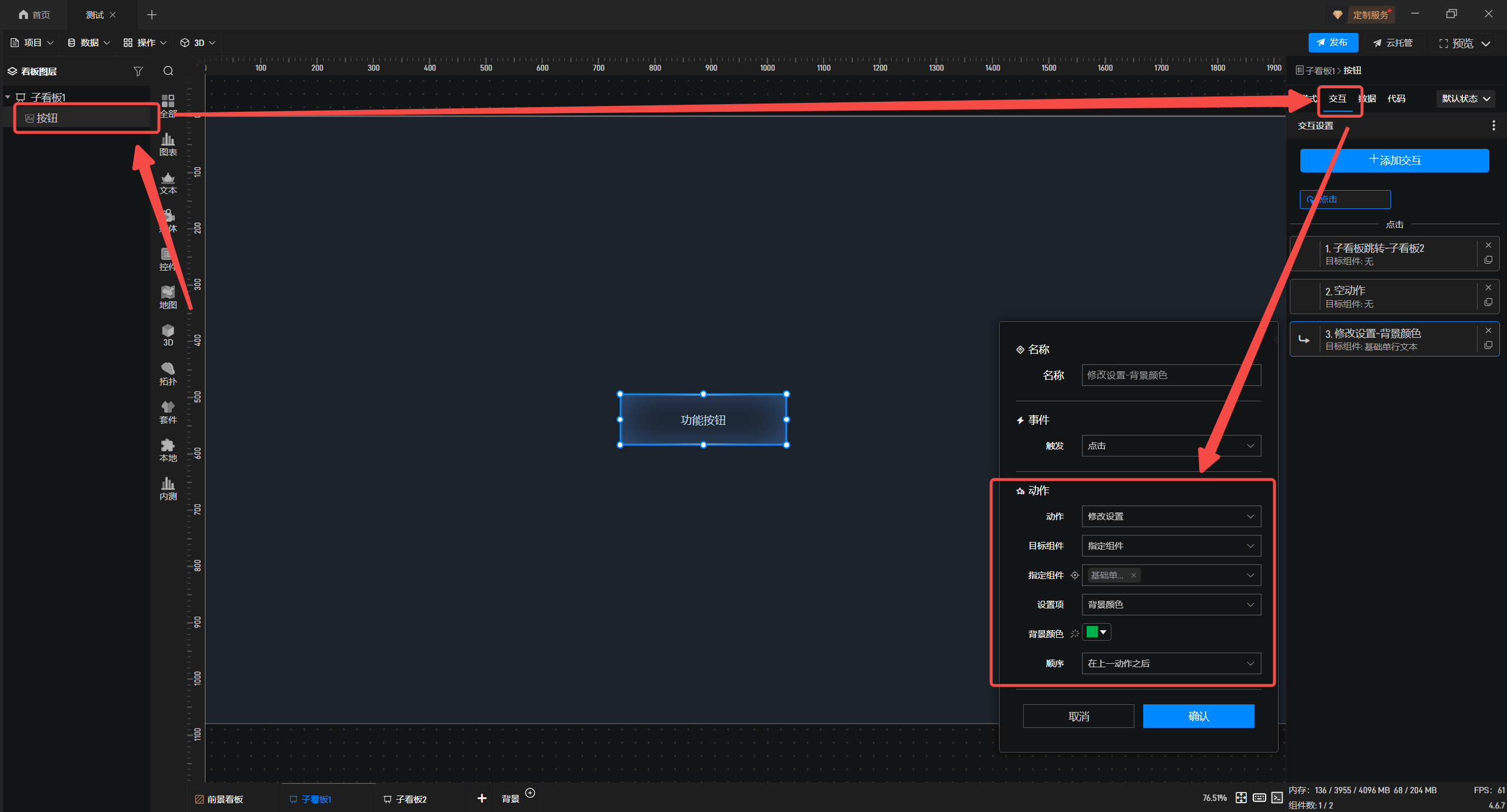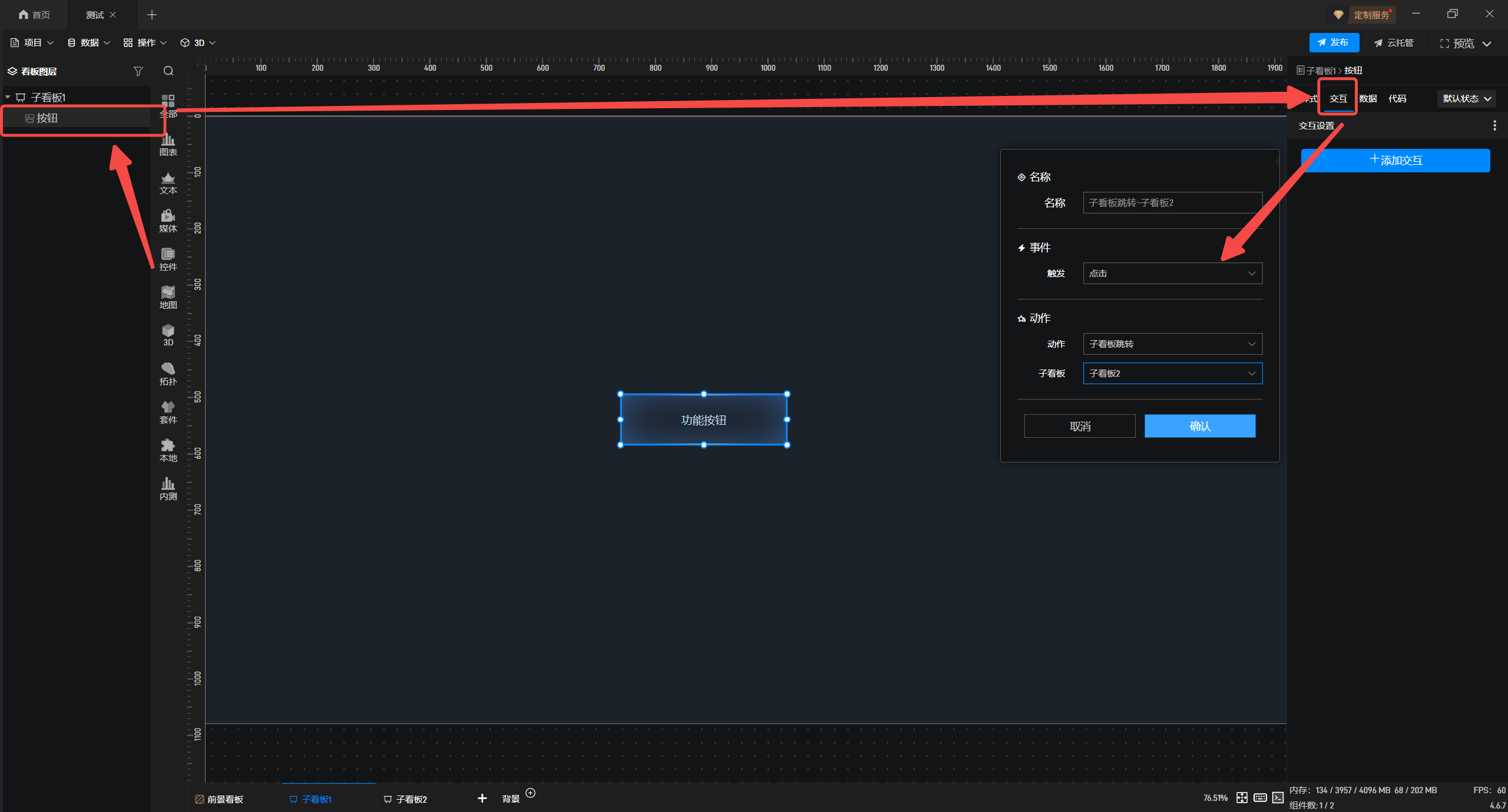 2.选中按钮组件,在右侧“配置”栏中选择 “交互”,触发“点击”事件,“动作”为“子看板跳转”,“子看板”选择需要跳转的看板即可。
